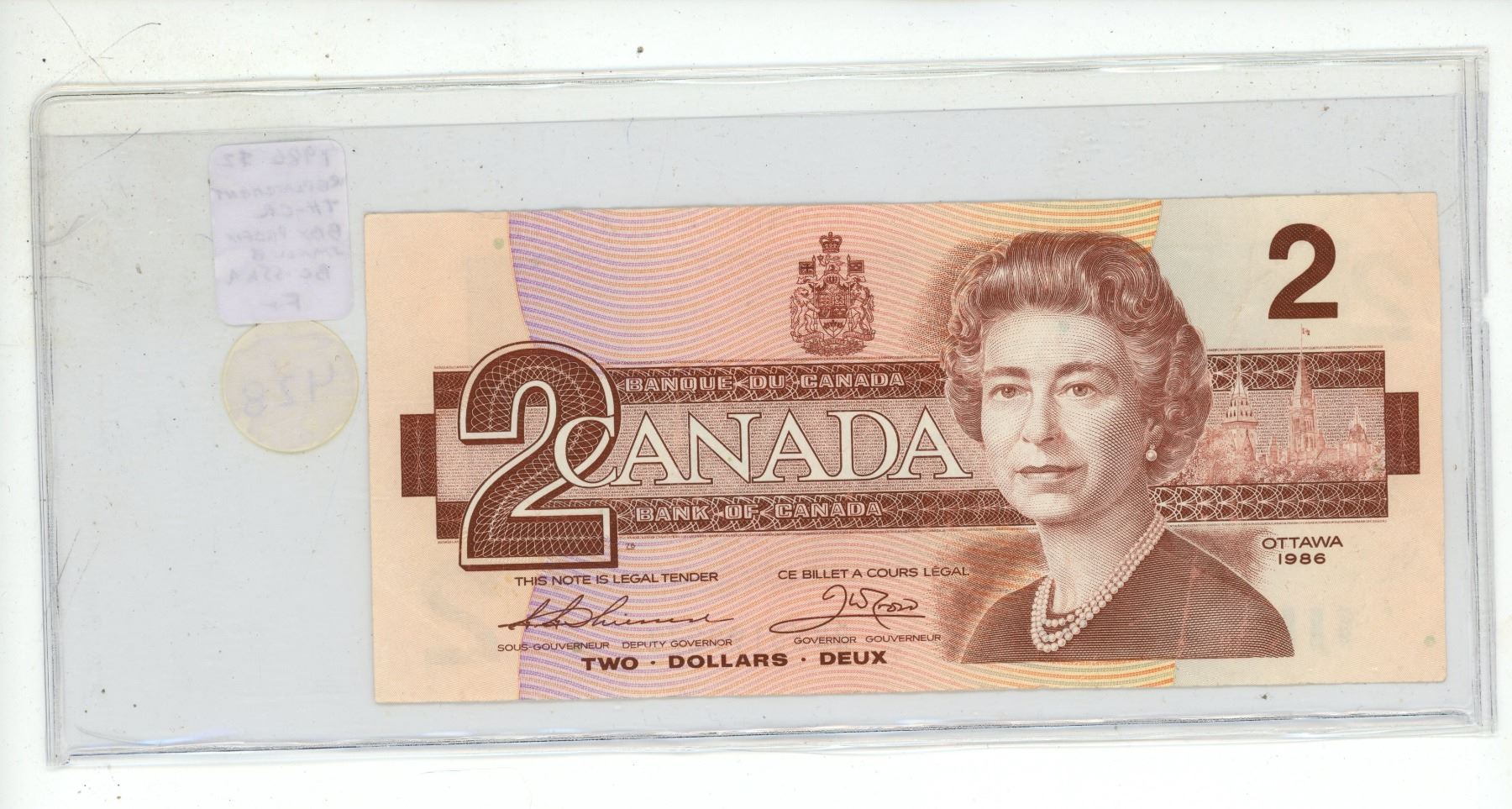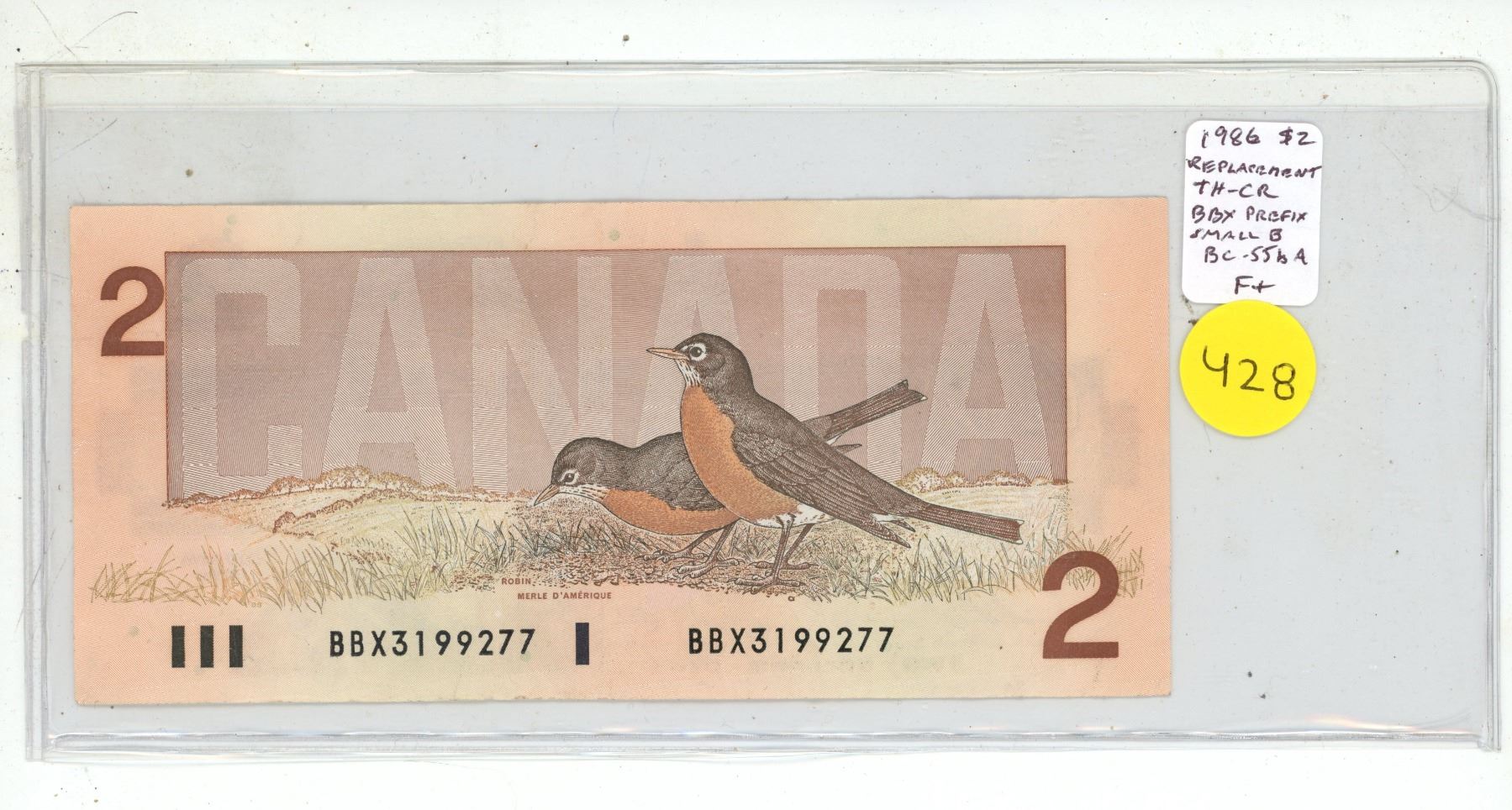 1986 $2 Replacement note. Thiessen-Crow signatures. BBX Replacement Prefix with Small B. BC-55bA. Fine15.