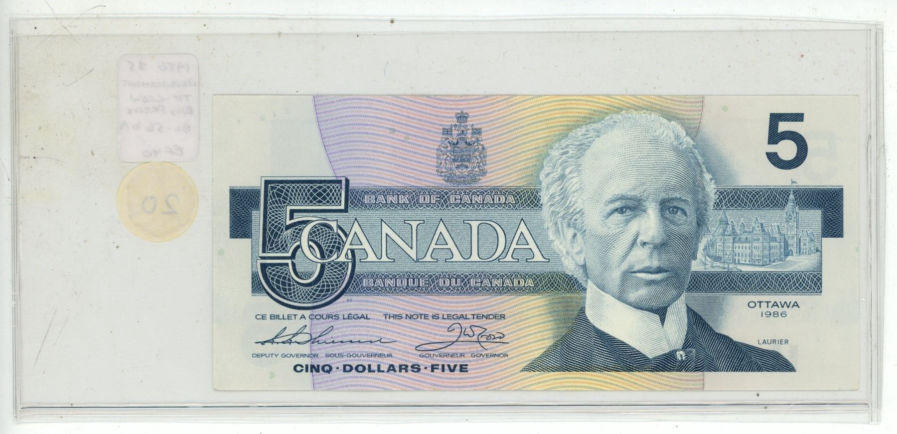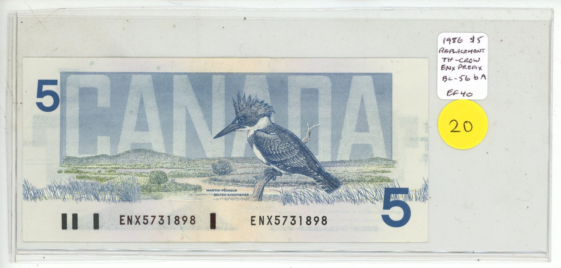 1986 $5 Replacement. Thiessen-Crow signatures. ENX Replacement Prefix. BC-56bA. EF40.