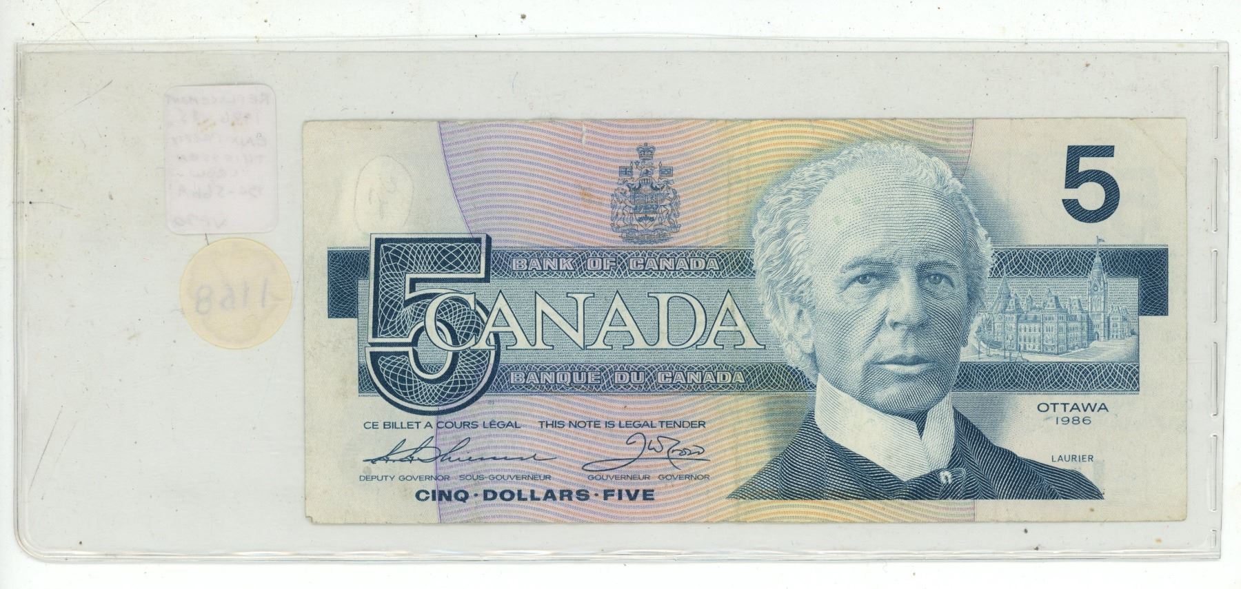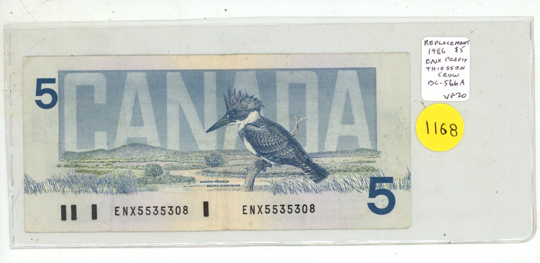 1986 $5 Replacement. Thiessen-Crow signatures. ENX Replacement Prefix. BC-56bA. VF20.