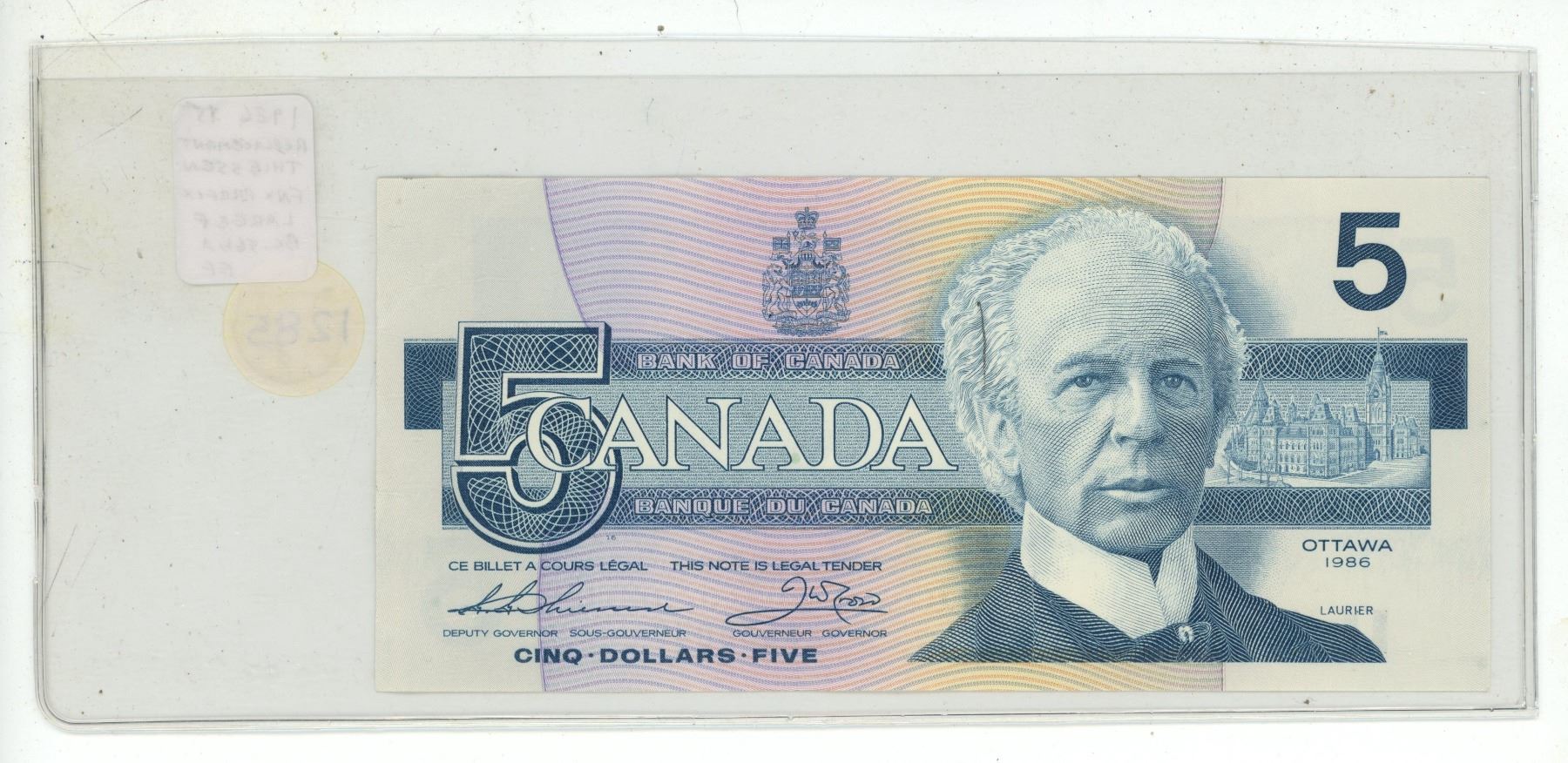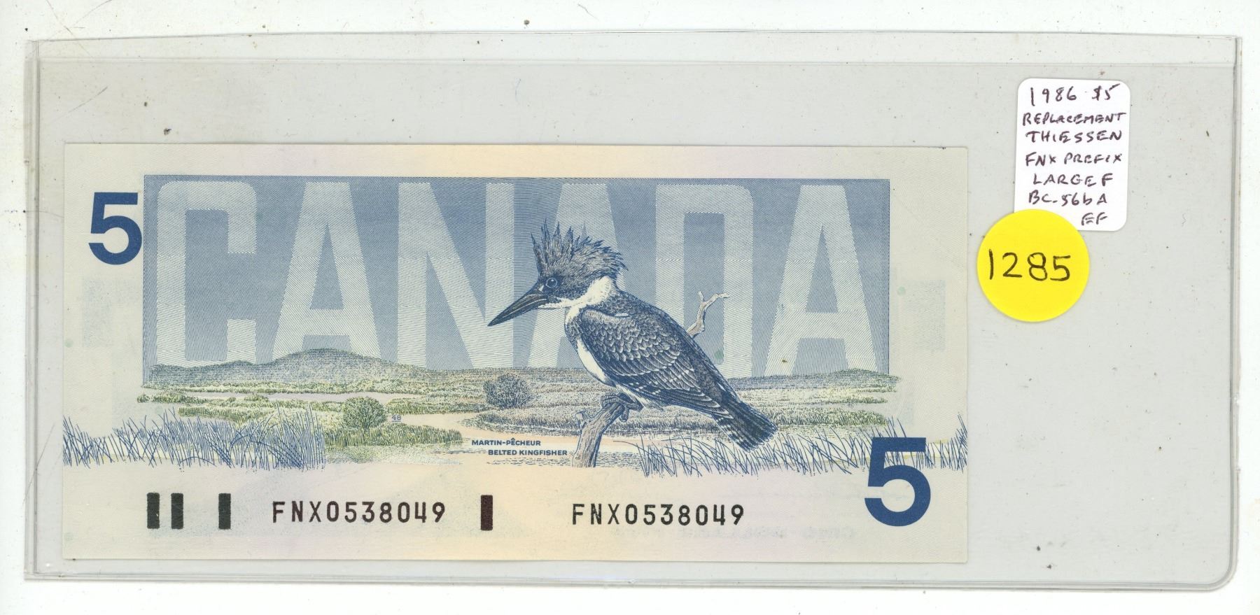 1986 $5 Replacement. Thiessen-Crow signatures. FNX Replacement Prefix with Large F. BC-56bA. EF.
