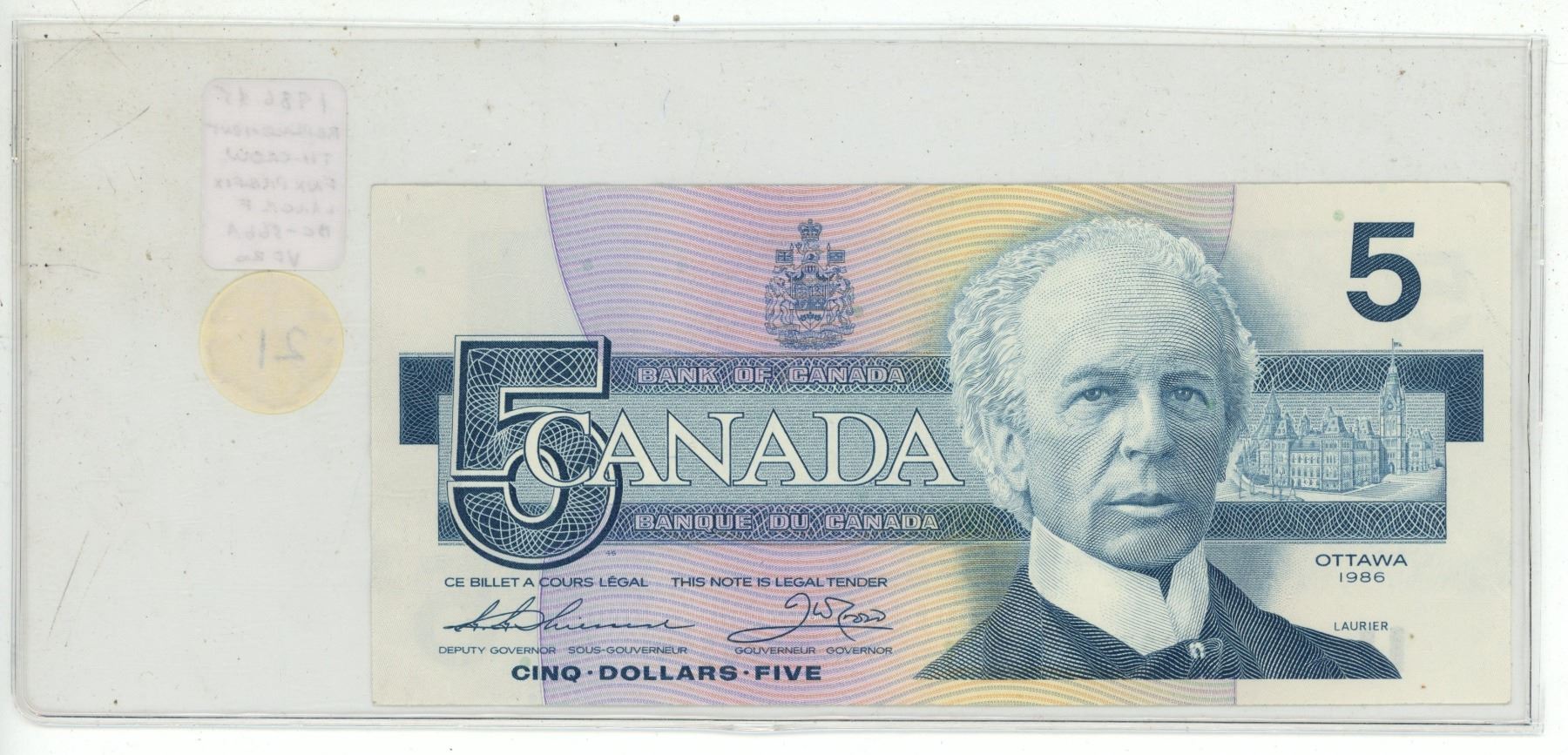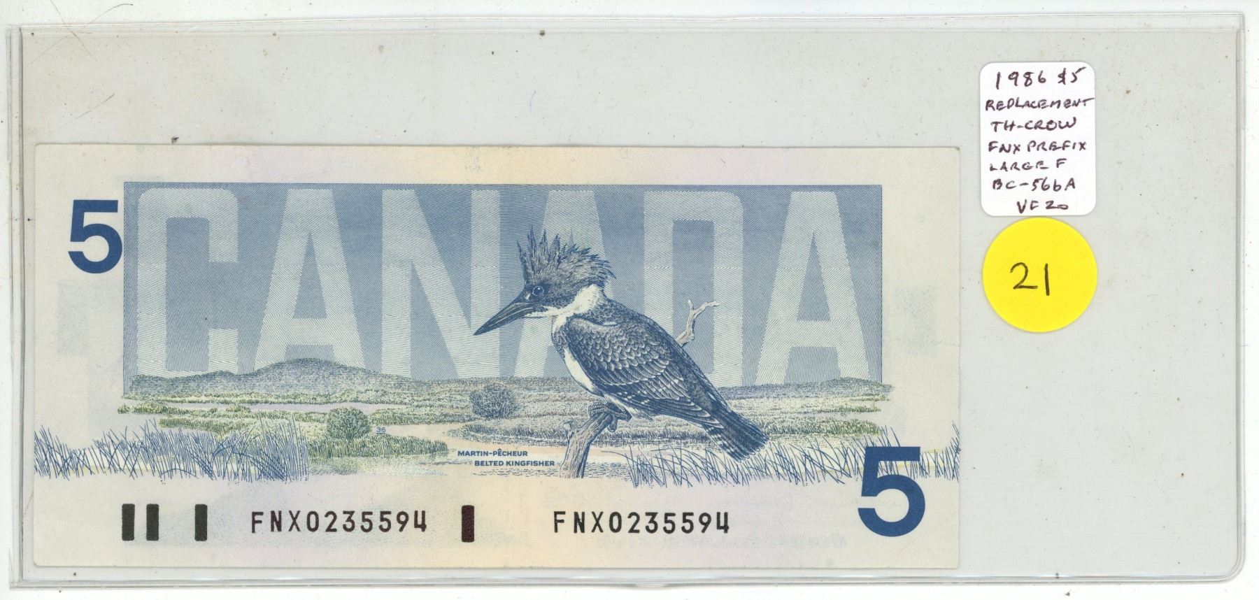 1986 $5 Replacement. Thiessen-Crow signatures. FNX Replacement Prefix with Large F. BC-56bA. VF20.