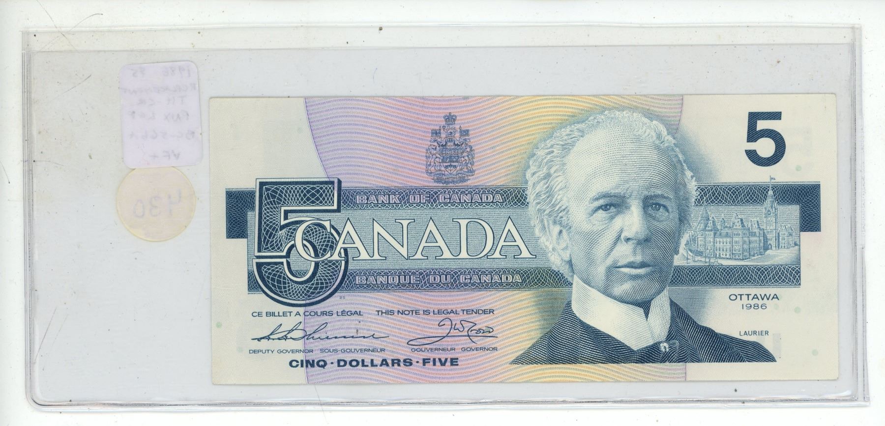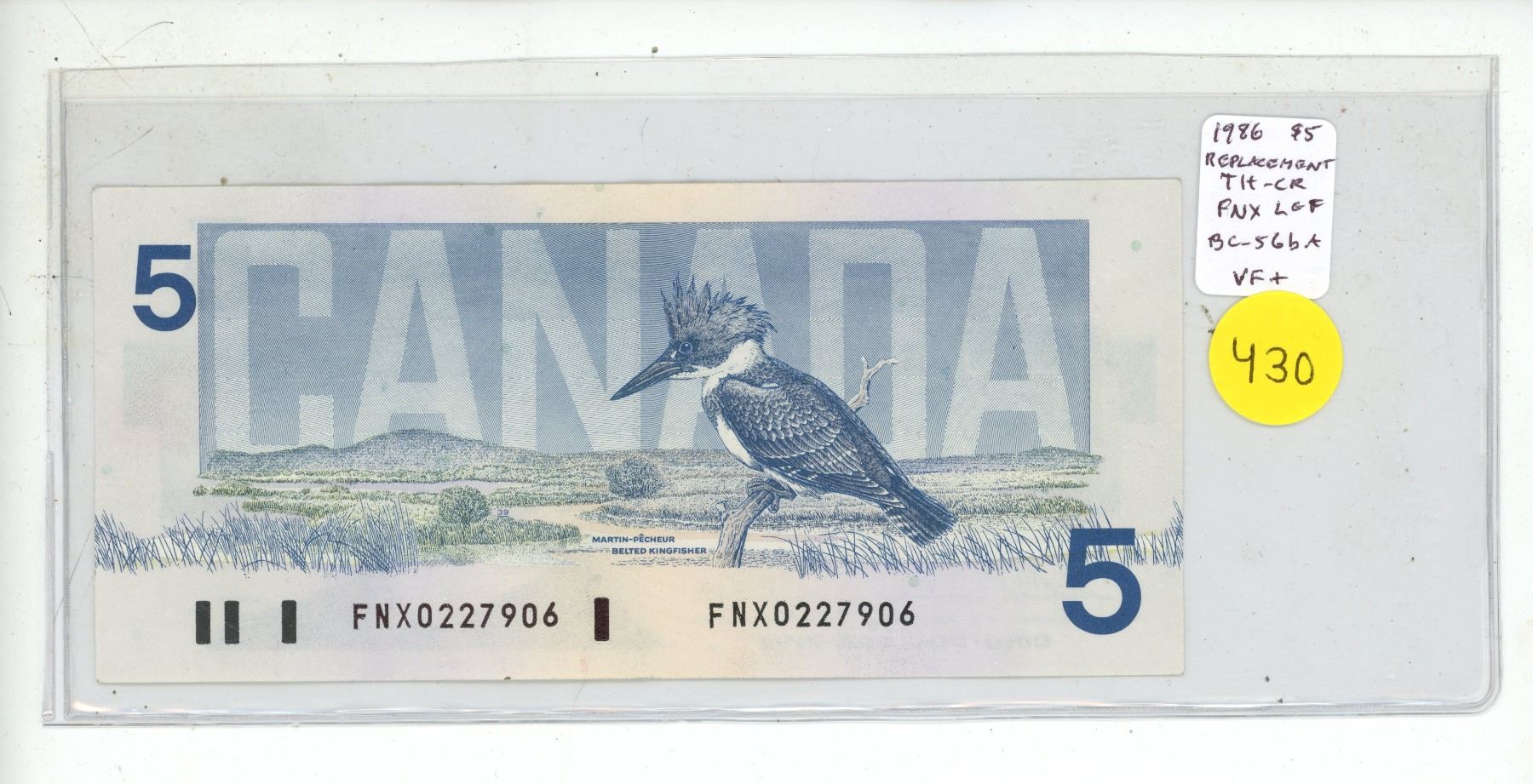 1986 $5 Replacement note. Thiessen-Crow signatures. FNX Replacement Prefix with Large F. BC-56bA. VF30.