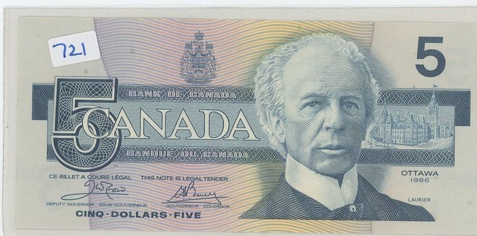 1986 Bank of canada $5.00 Bill Sig. Crow & Bouey
