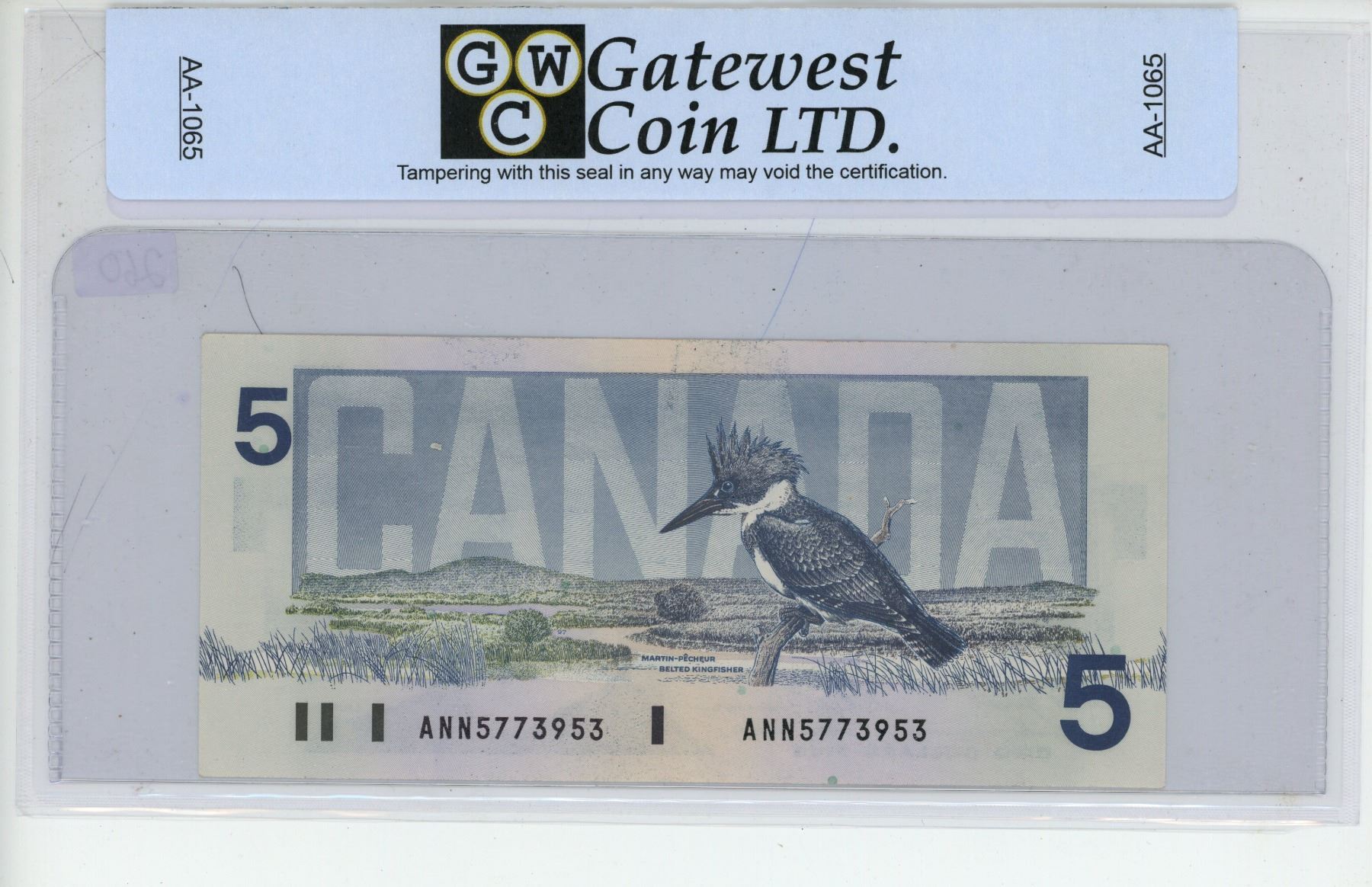 1986 GWC graded, Canadian 5 dollar bill - Knight/Thiessen - ANN 5773953 - UNC62