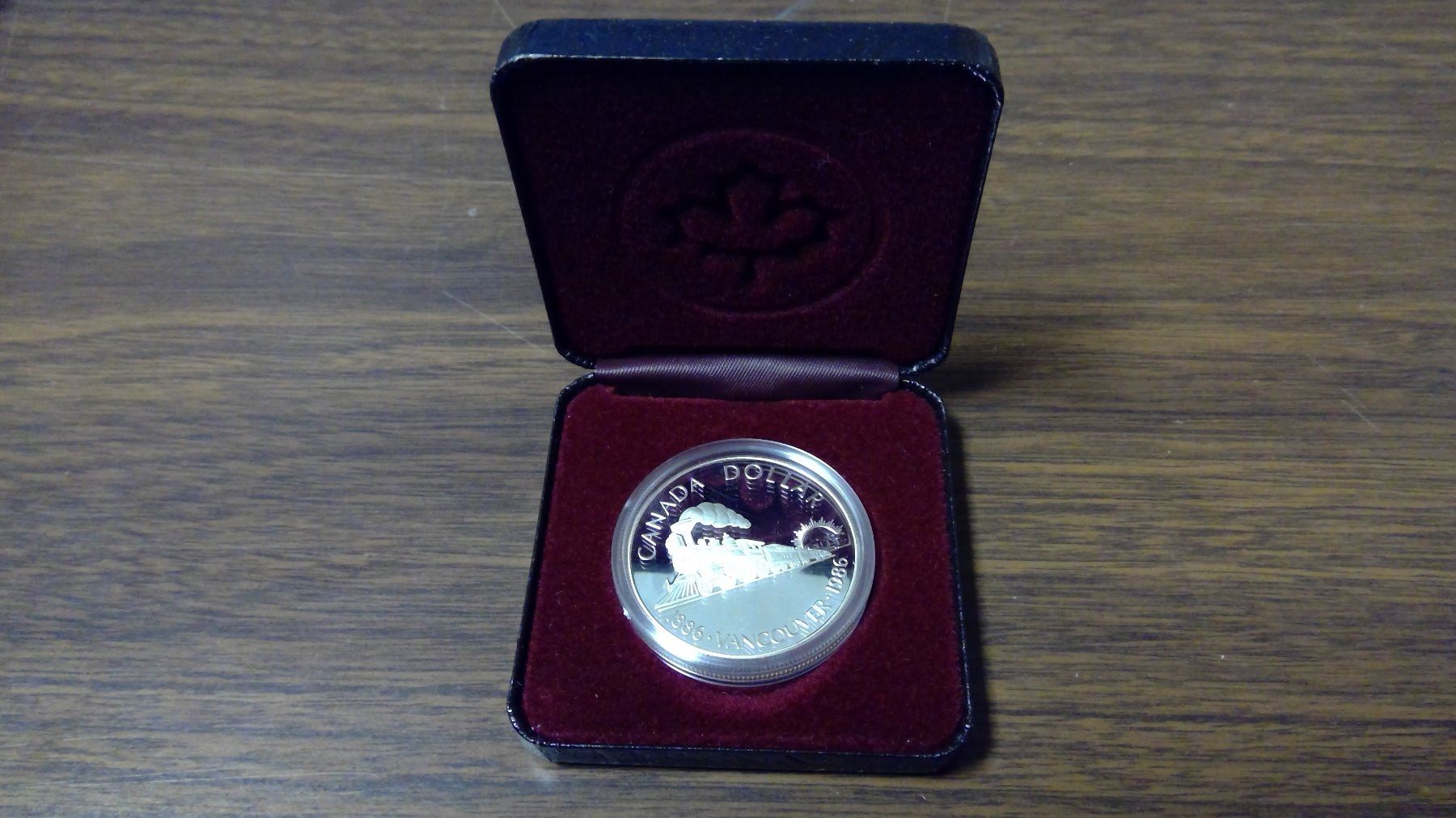 1986 Proof silver dollar. Centennial of the founding of Vancouver and the arrival of the first trans-Canada train. Ultra Heavy Cameo. Cased.