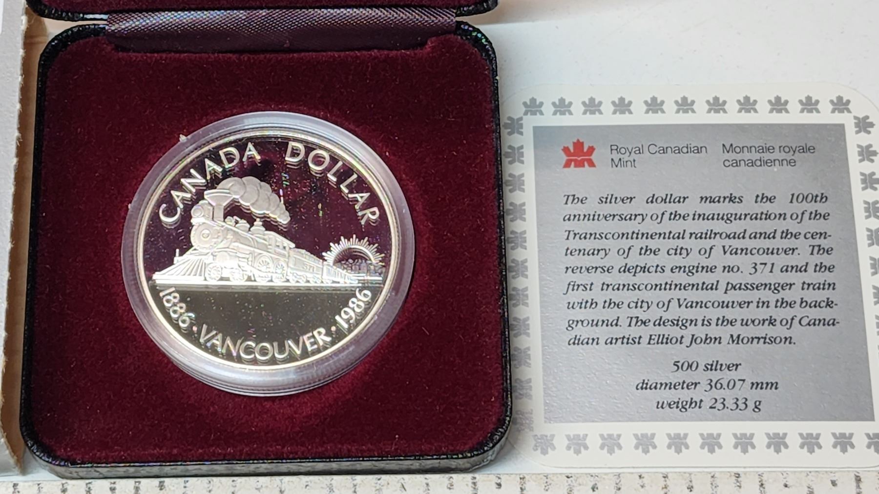1986 Vancouver Centennial Proof Silver Dollar. Popular train. Bright White with Ultra Heavy Cameo. Housed in its original case & box of issue.