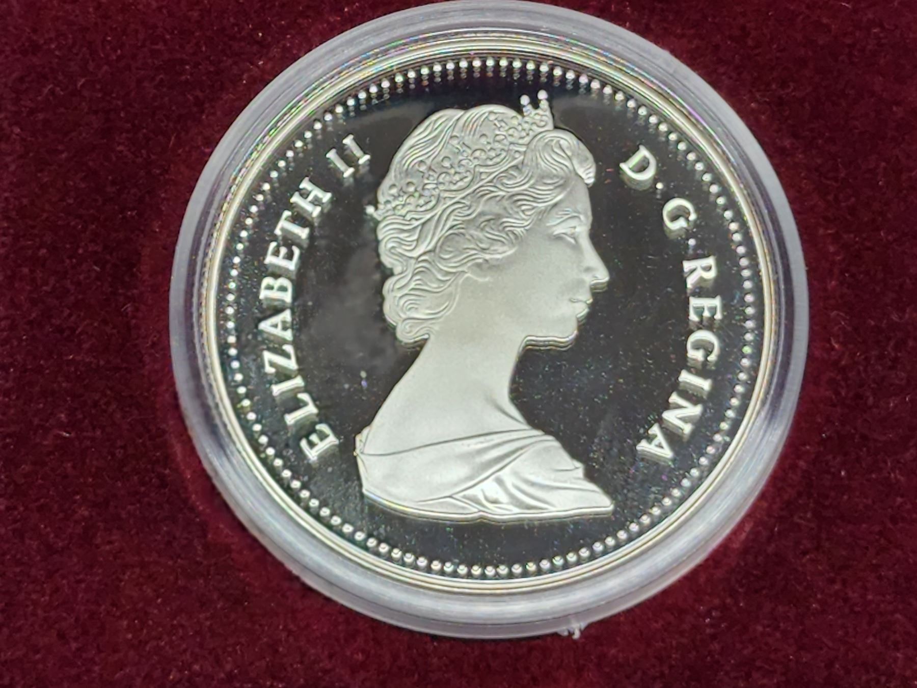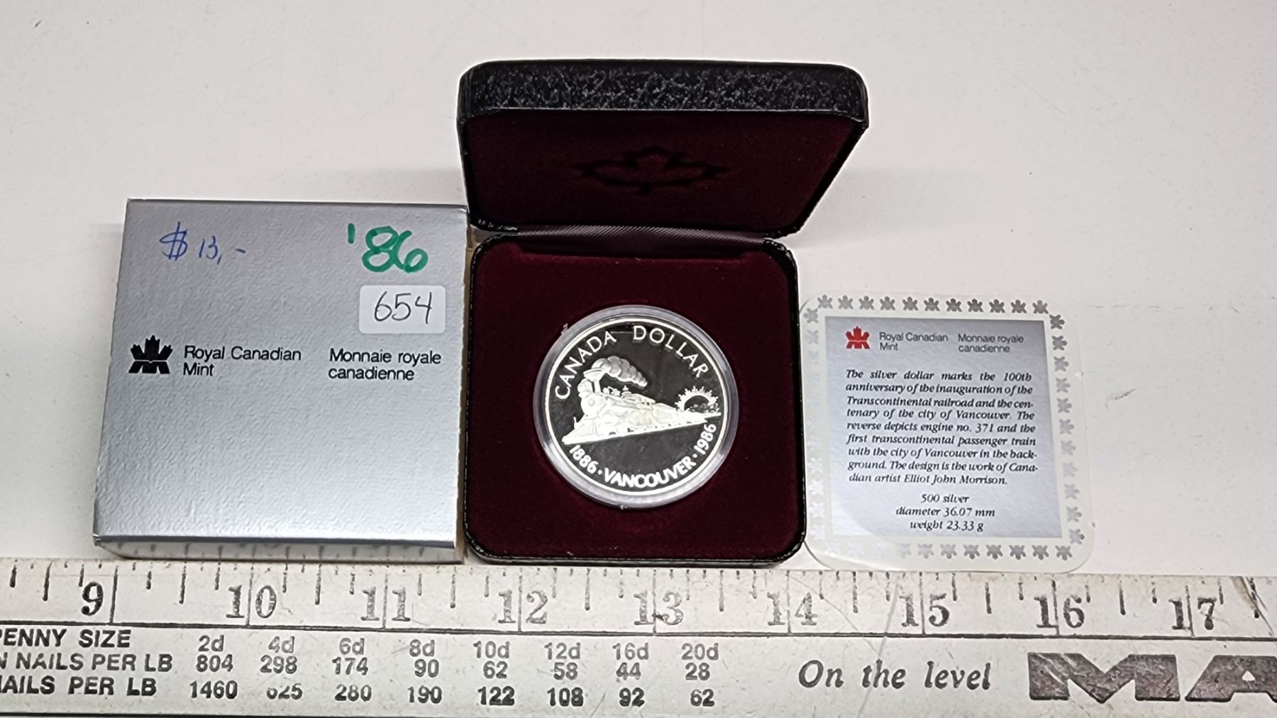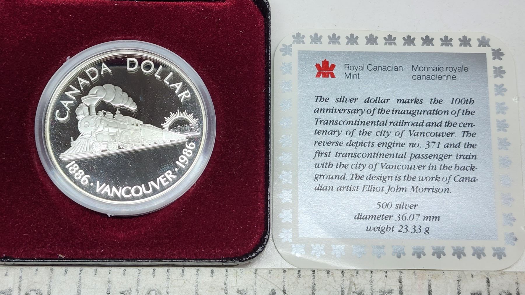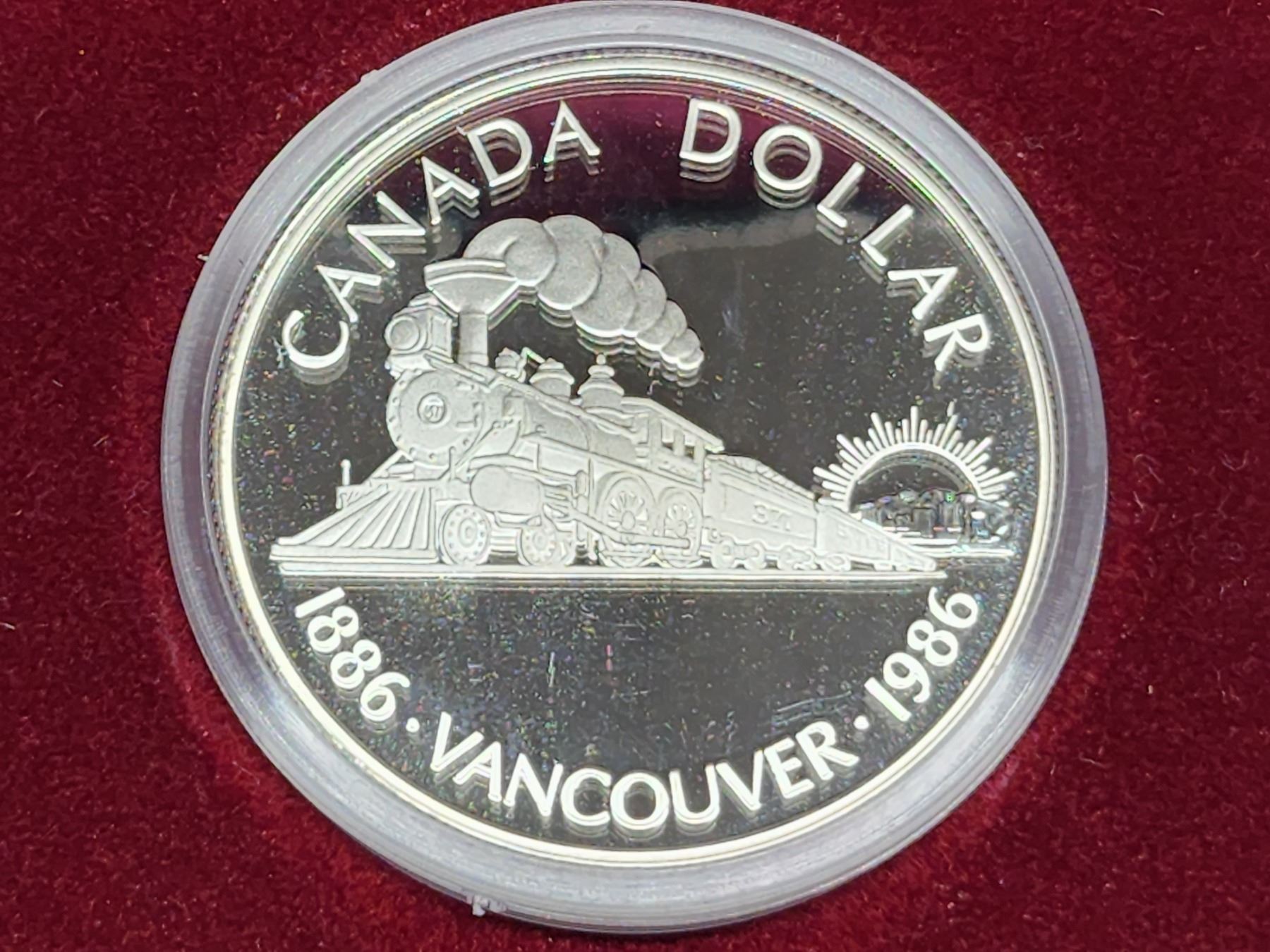 1986 Vancouver Centennial Silver Dollar. 100th Anniversary of the founding of Vancouver and the arrival of the first trans-Canada train in Vancouver. Proof with Ultra Heavy Cameo. Housed in its original case & box of issue.