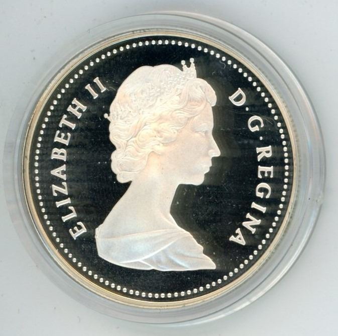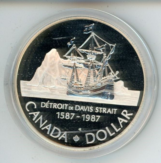 1987 Davis Strait Proof Silver Dollar. 400th Anniversary of explorer John Davis’s search for the North West Passage. Housed in its original hard plastic holder.