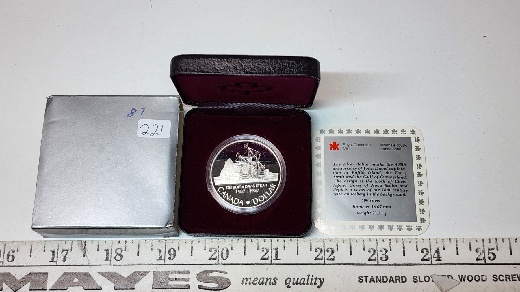 1987 John Davis Proof Silver Dollar. 400th Anniversary of John Davis’ expedition to find the North West Passage. Bright White with Ultra Heavy Cameo. Housed in its original case & box of issue.