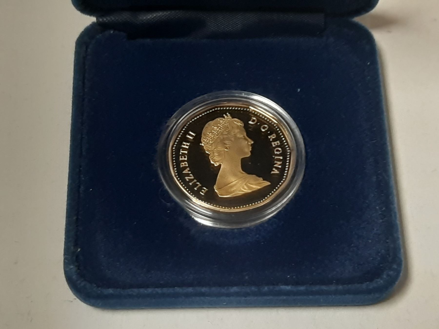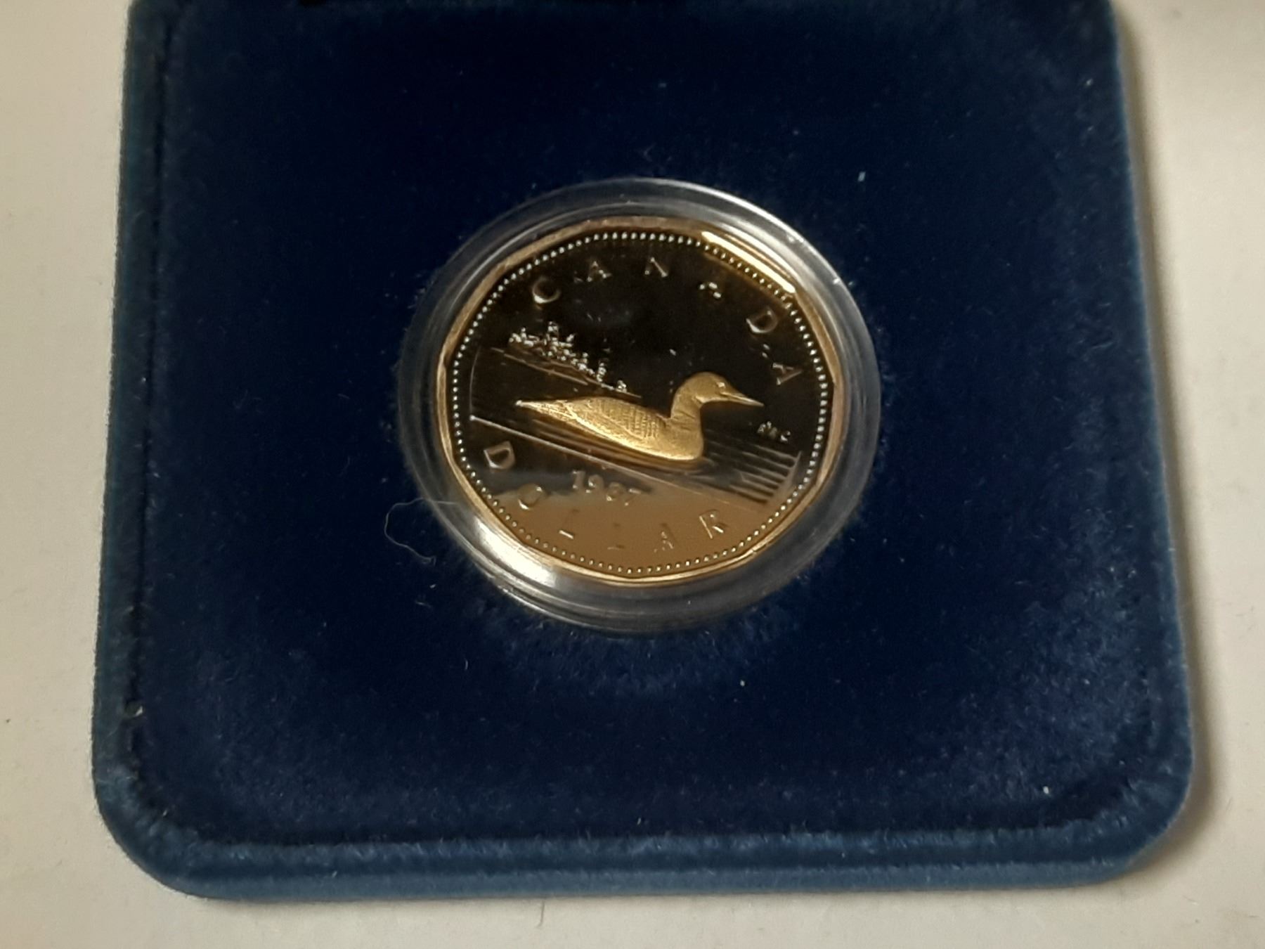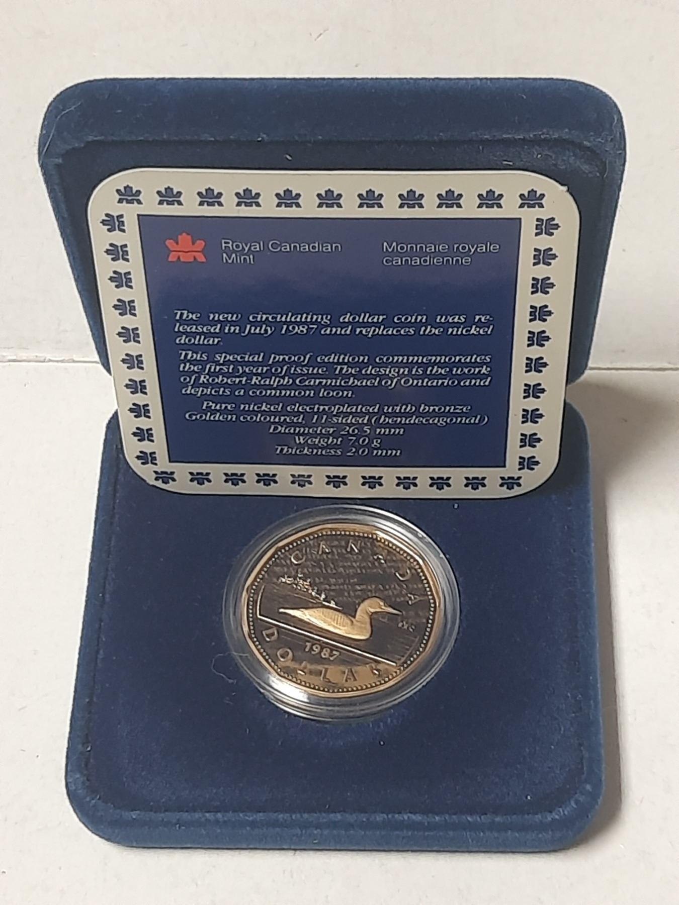 1987 Proof Loonie Dollar. Ultra Heavy Cameo. The first year of the Loonie. Housed in its original Royal Canadian Mint case.