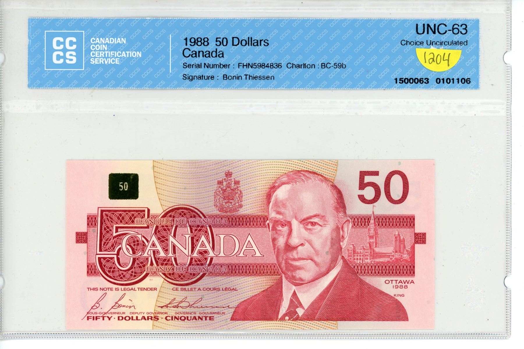 1988; $50 Bill FHN5984836 Bonin Thiessen; Graded choice UNC-63