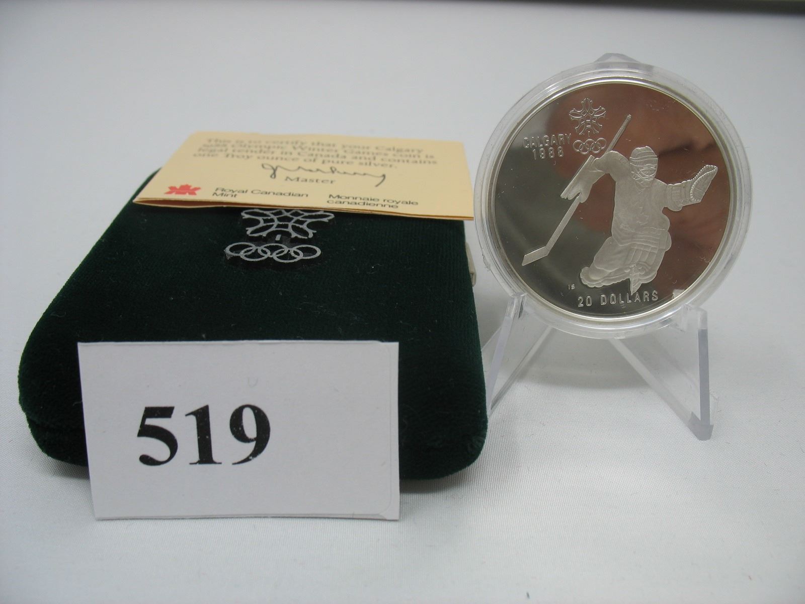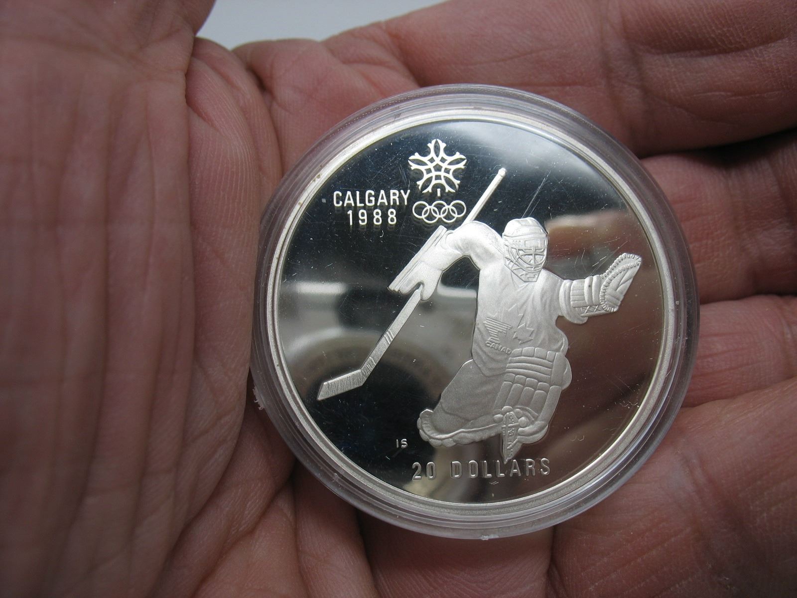 1988 CANADIAN MINT - CALGARY OLYMPICS $20 SILVER COIN - .925 FINE - HOCKEY - 1 TROY OZ