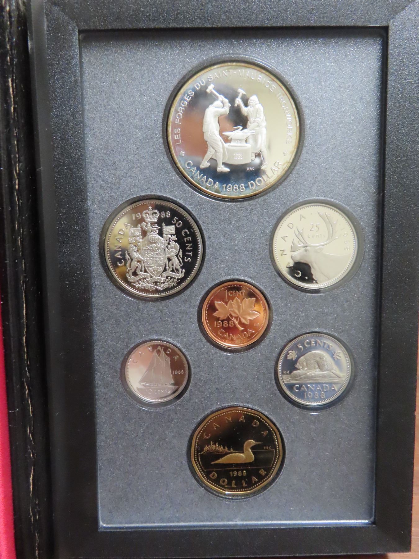1988 Double Dollar Proof Set. Silver Dollar commemorates the first heavy industry in Canada. Proof with Ultra Heavy Cameos. Housed in its original Royal Canadian Mint case of issue. Includes Certificate of Authenticity.