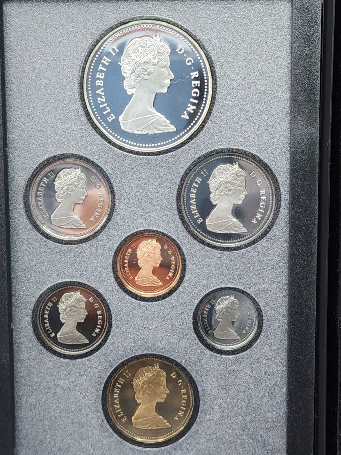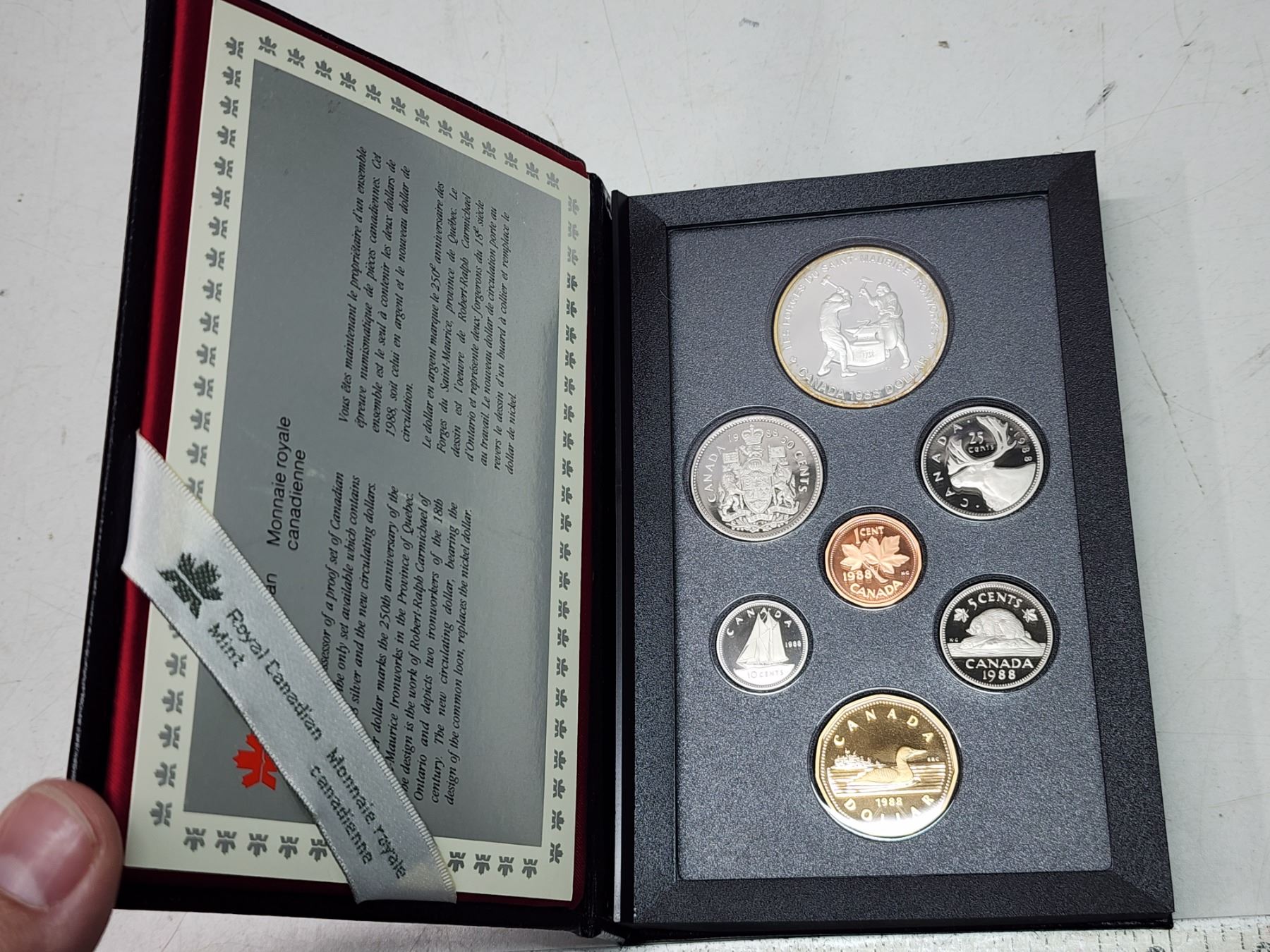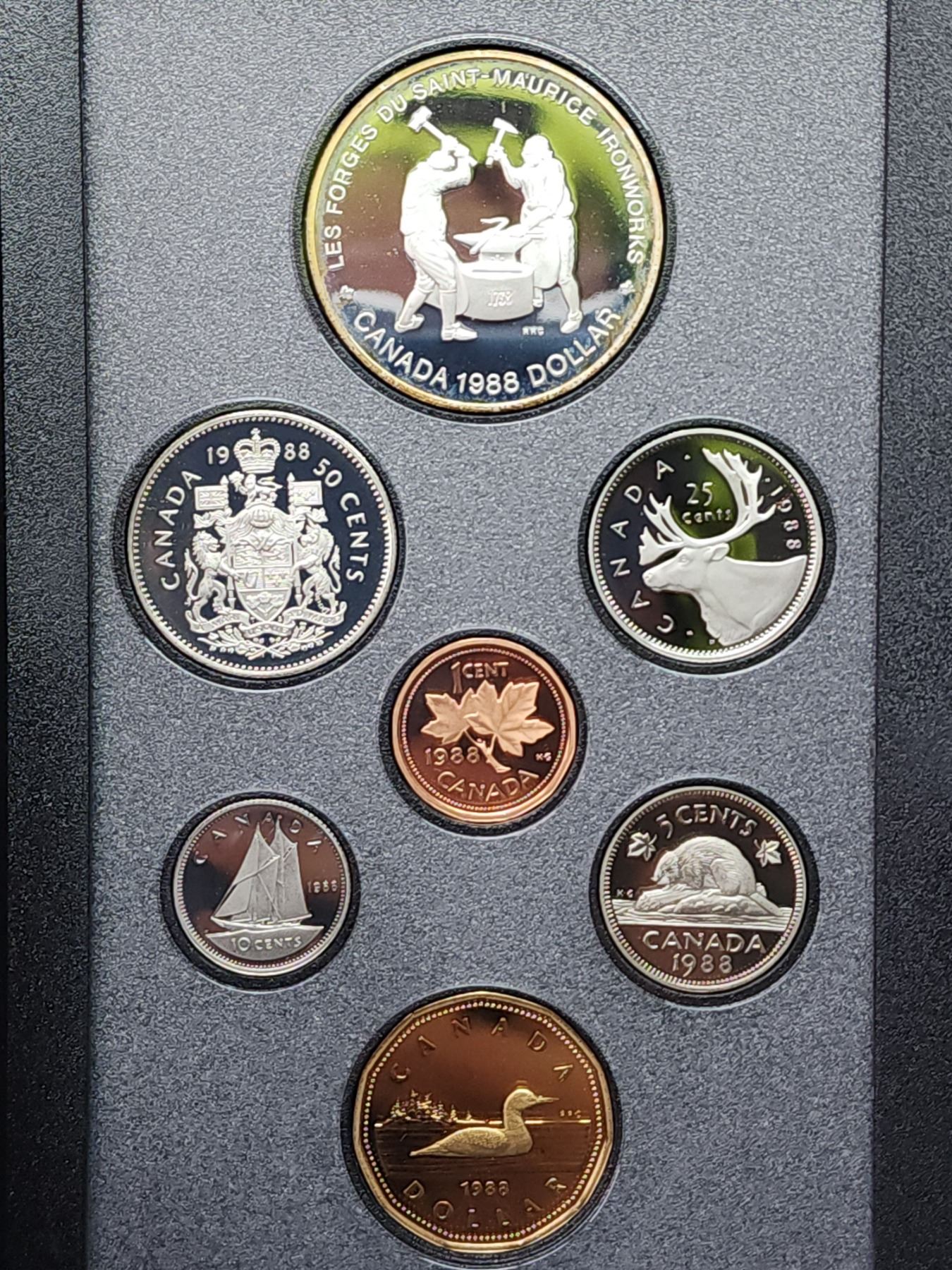 1988 Double Dollar Proof Set. Silver Dollar commemorates the first heavy industry in Canada. Silver Dollar is nicely toned. All coins have Ultra Heavy Cameos. Housed in its original Royal Canadian Mint case of issue. Includes Certificate of Authenticity.