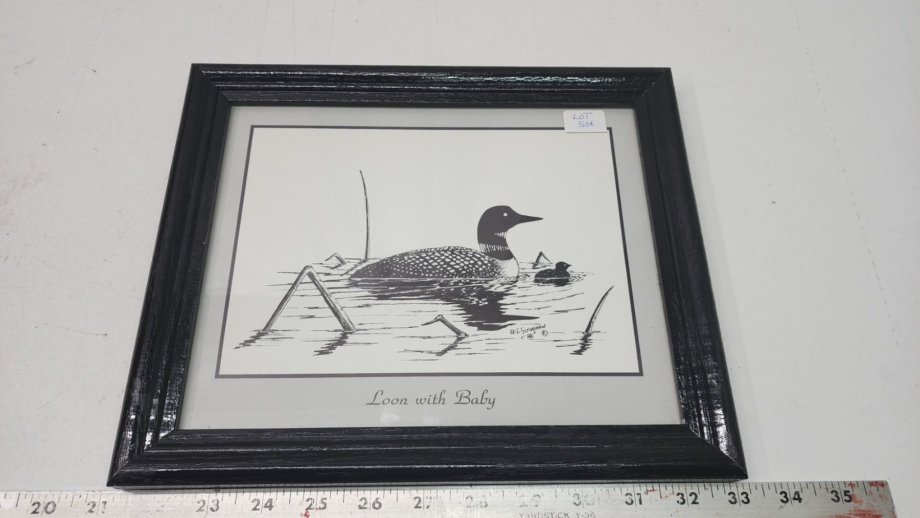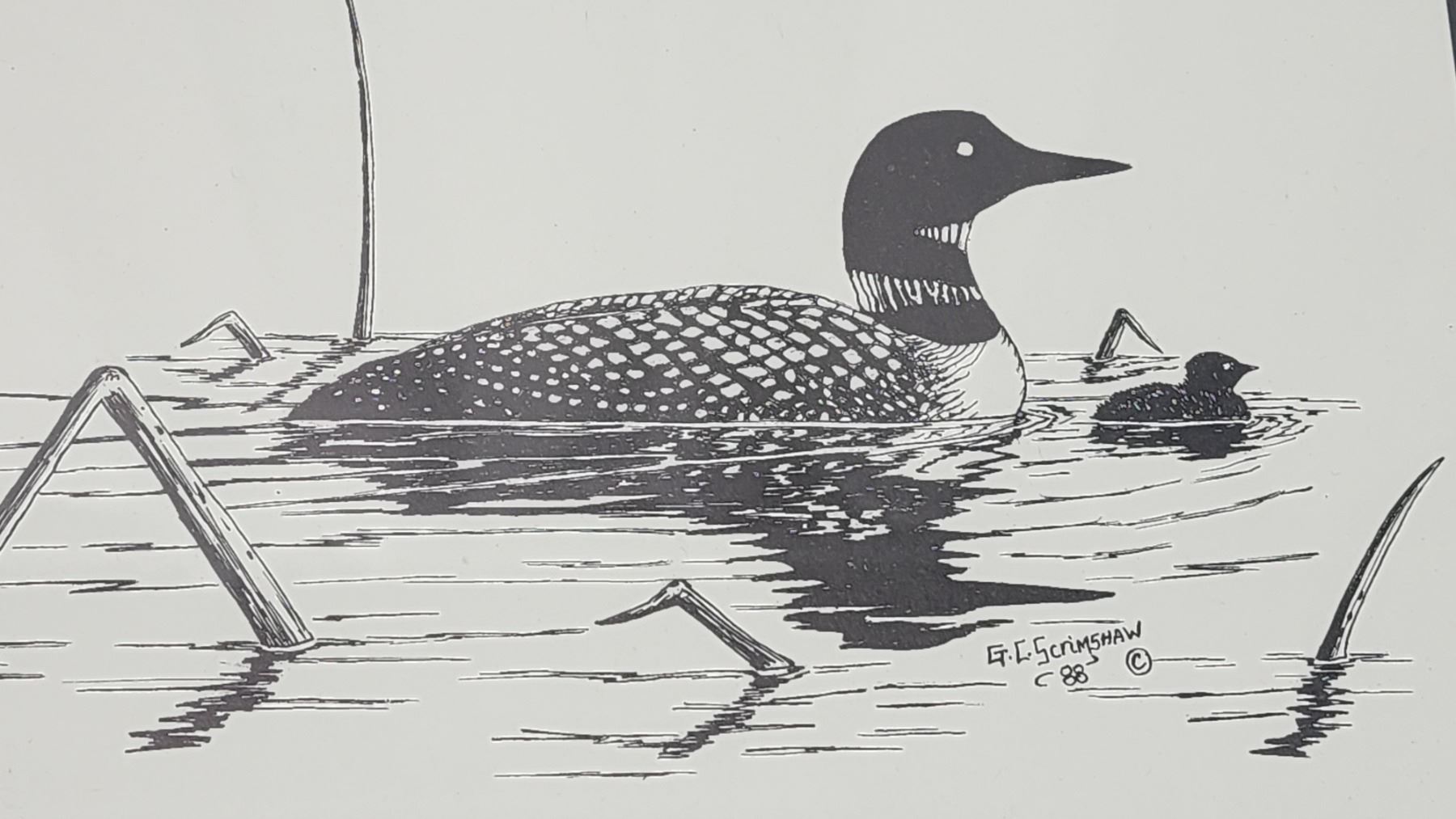 1988 "Loon with baby" framed art print, by Glen Scrimshaw - 11.5"x9.5"