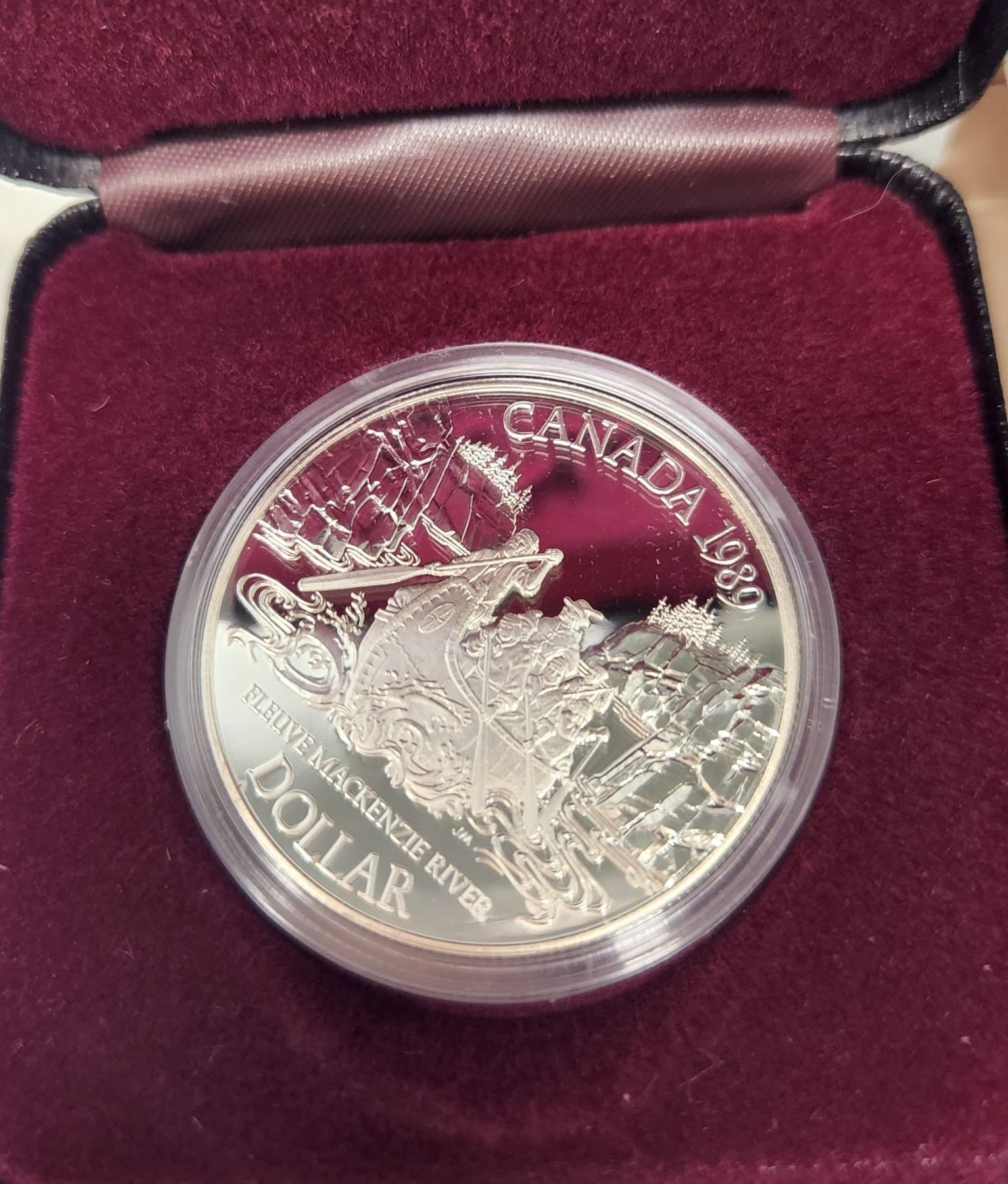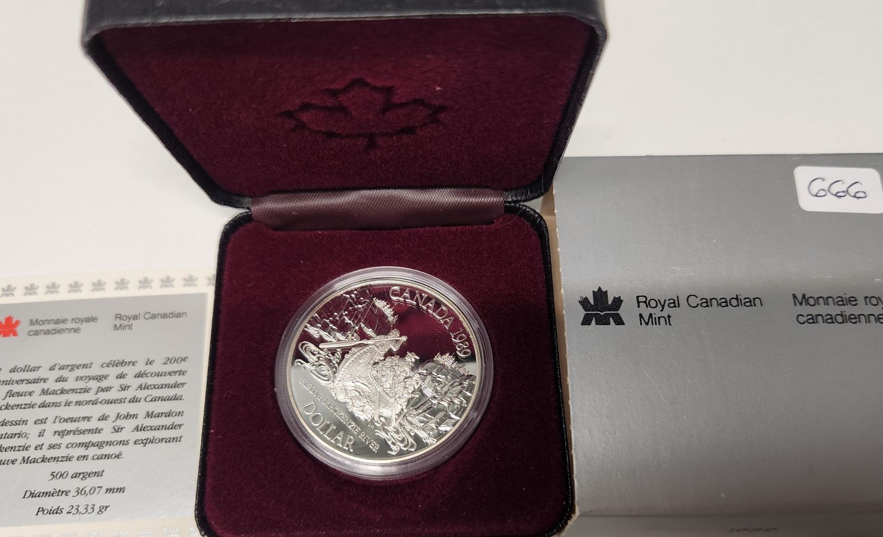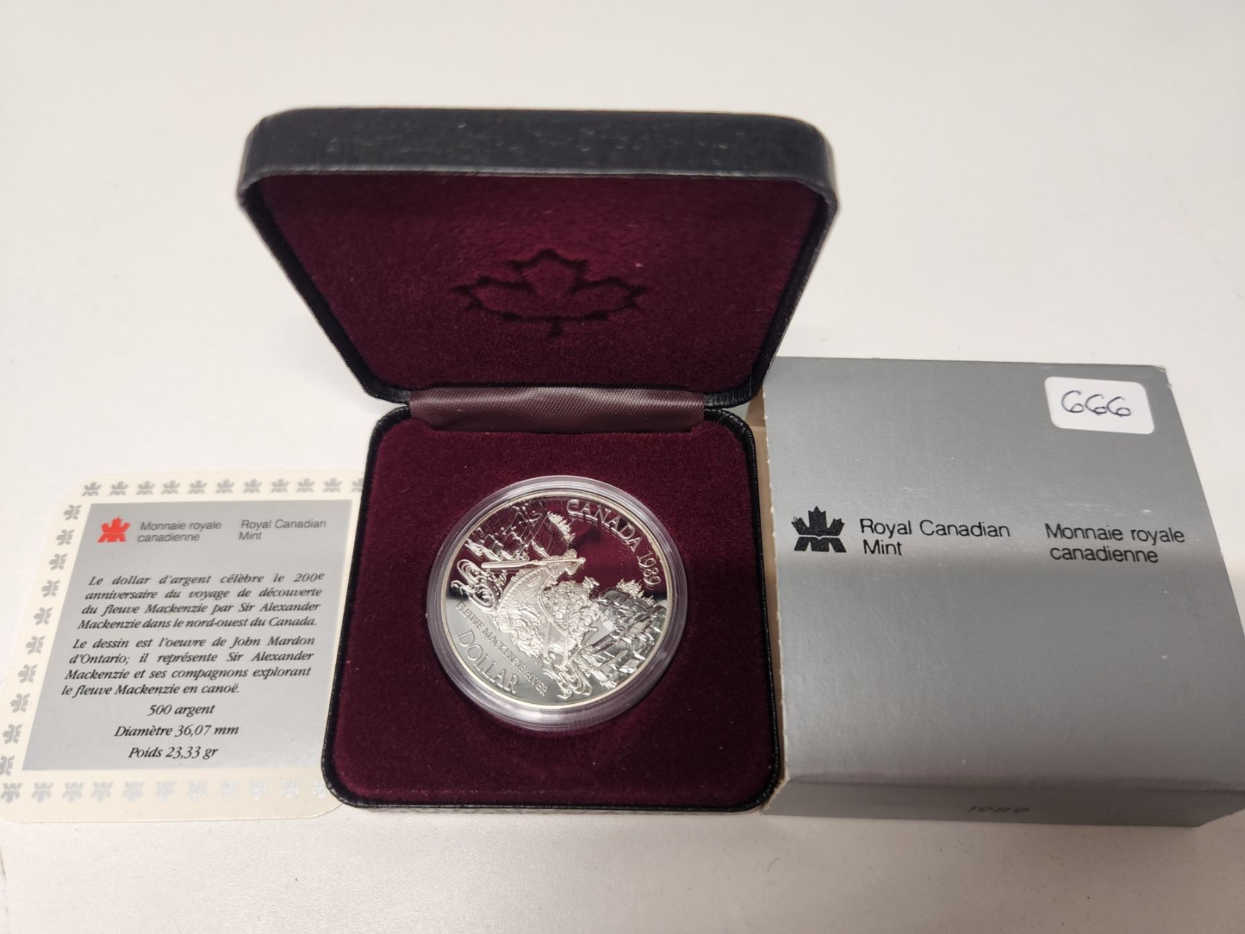 1989 Alexander Mackenzie Proof Silver Dollar. Commemorates the 200th Anniversary of Alexander Mackenzie’s voyage of the Mackenzie River to the Arctic Ocean. Bright White with Ultra Heavy Cameo. In case and box of issue.