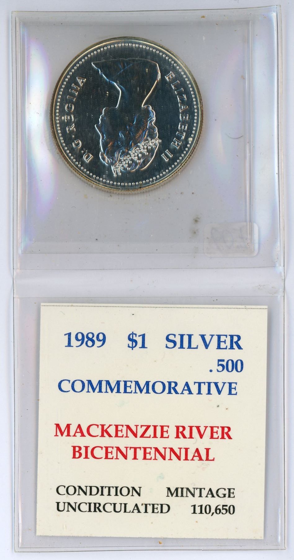1989 Canadian Silver Dollar. Commemorates the 200th Anniversary of Alexander Mackenzie’s journey down the Mackenzie River to the Arctic Ocean. Specimen.