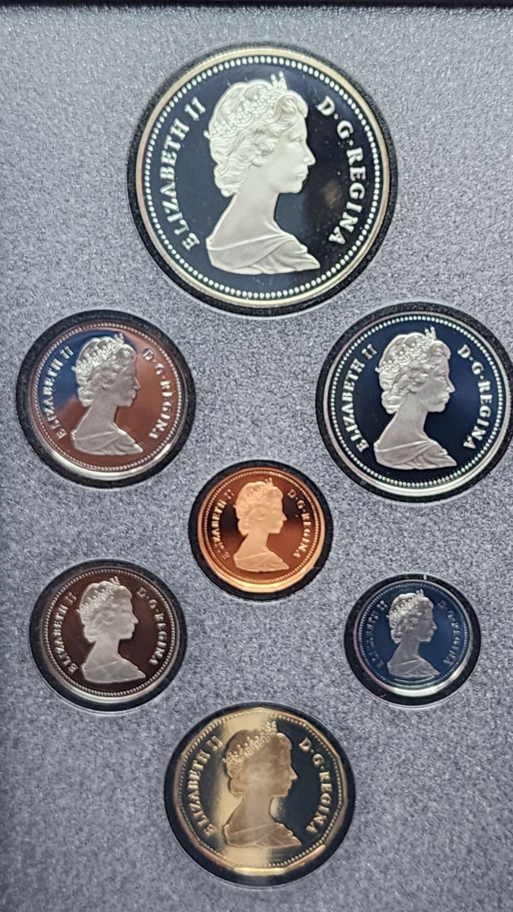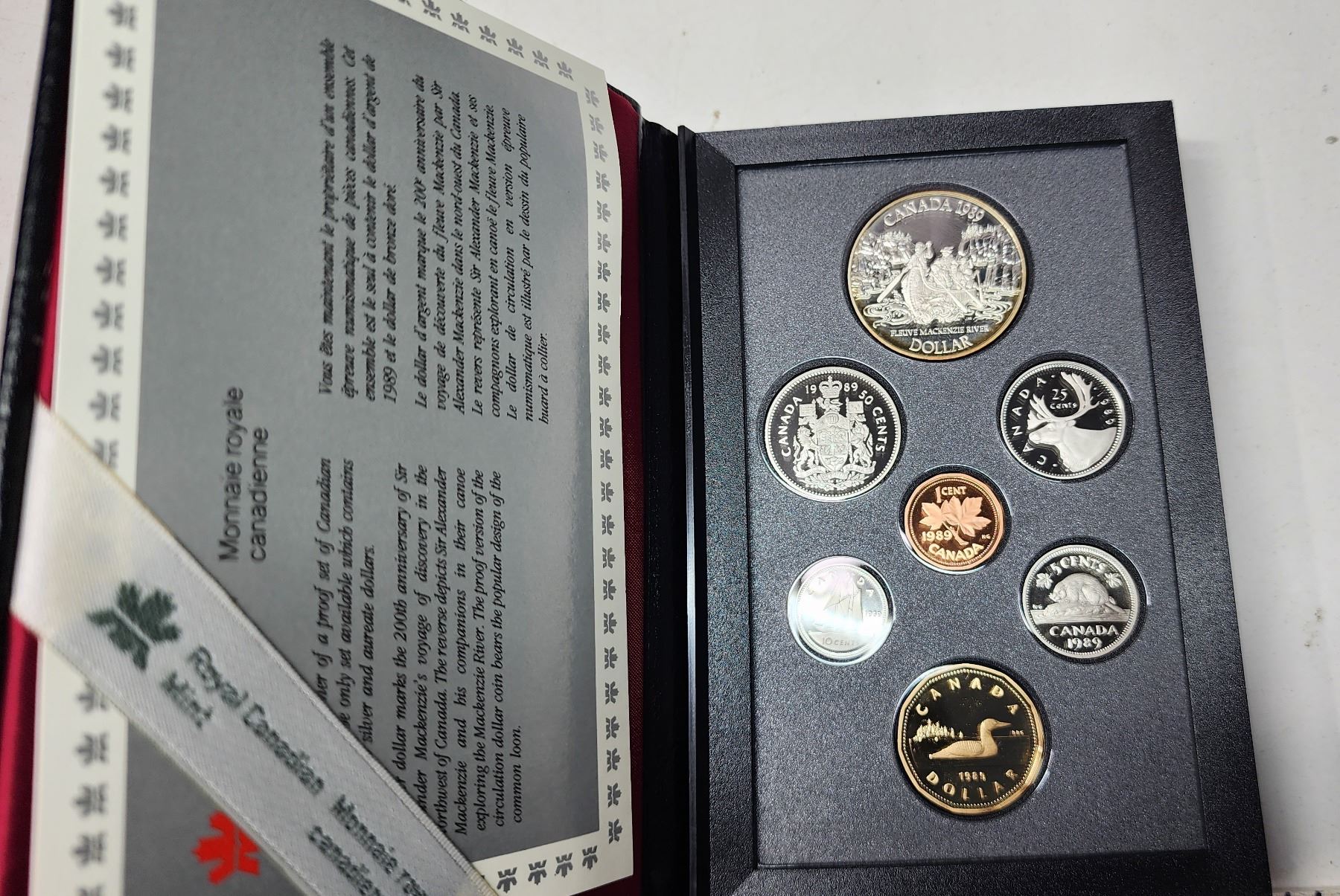 1989 Double Dollar Proof Set. Silver Dollar commemorates the 200th Anniversary of explorer Alexander Mackenzie’s canoe trip down the Mackenzie River to the Arctic Ocean. Bright White. Ultra Heavy Cameos. Housed in its original RCM case of issue.