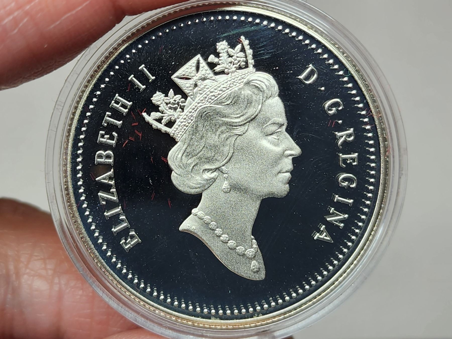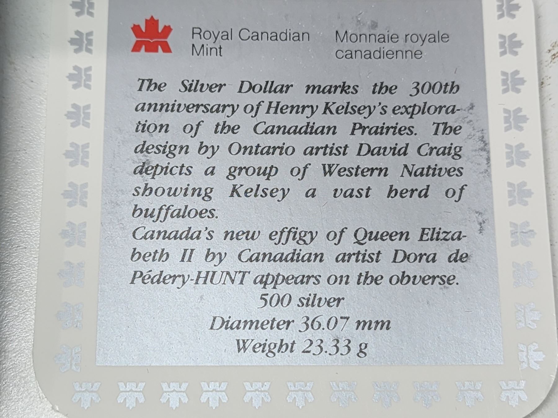 1990 Henry Kelsey Silver Dollar. 300th Anniversary of Hudson’s Bay Company fur trader Henry Kelsey’s exploration of the Canadian West. Proof with Ultra Heavy Cameo. Bright White. Housed in its original RCM case of issue.