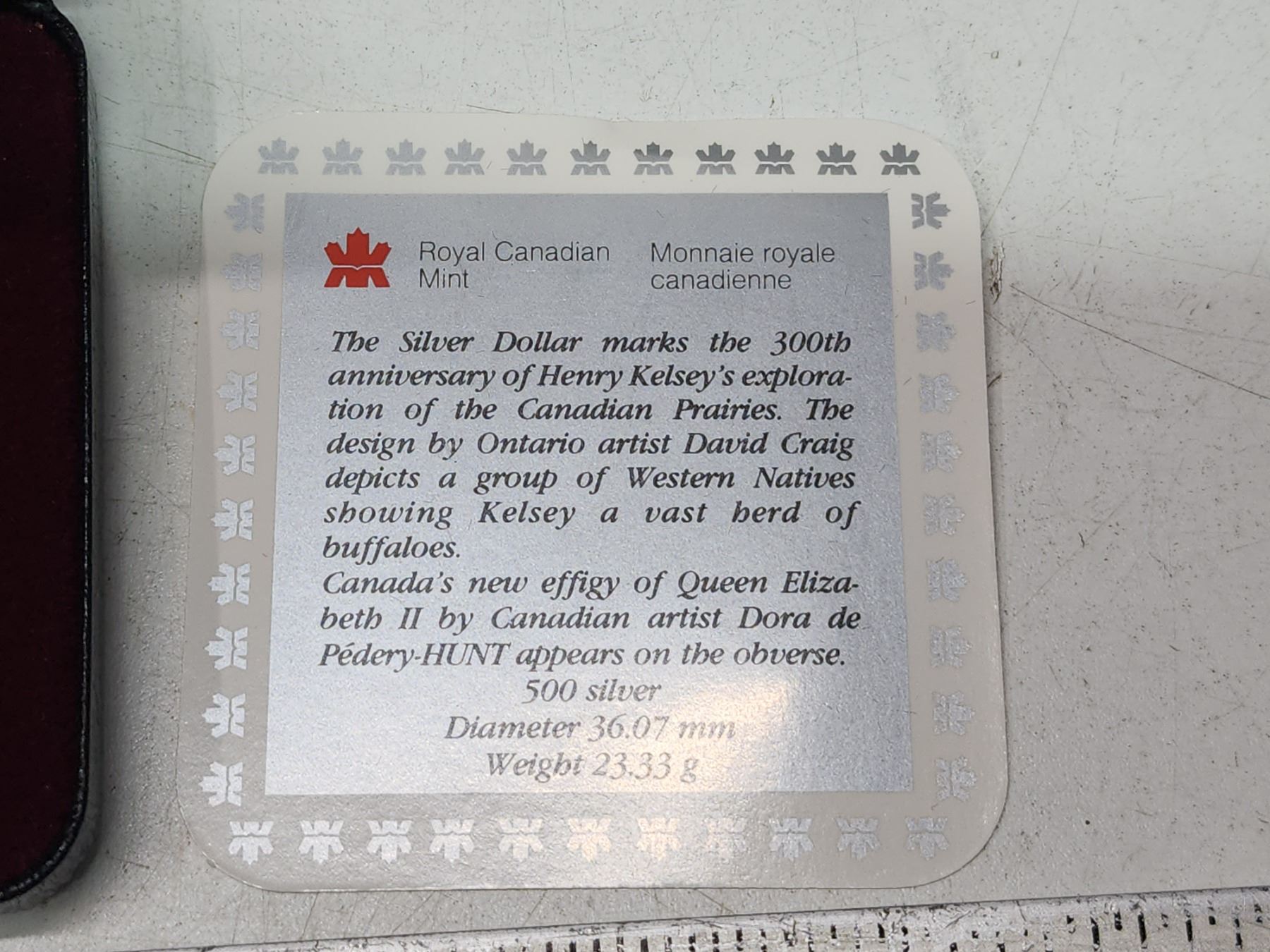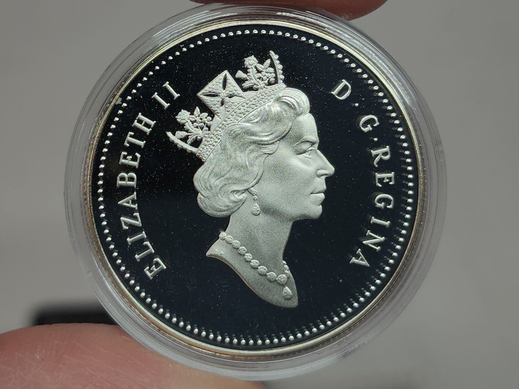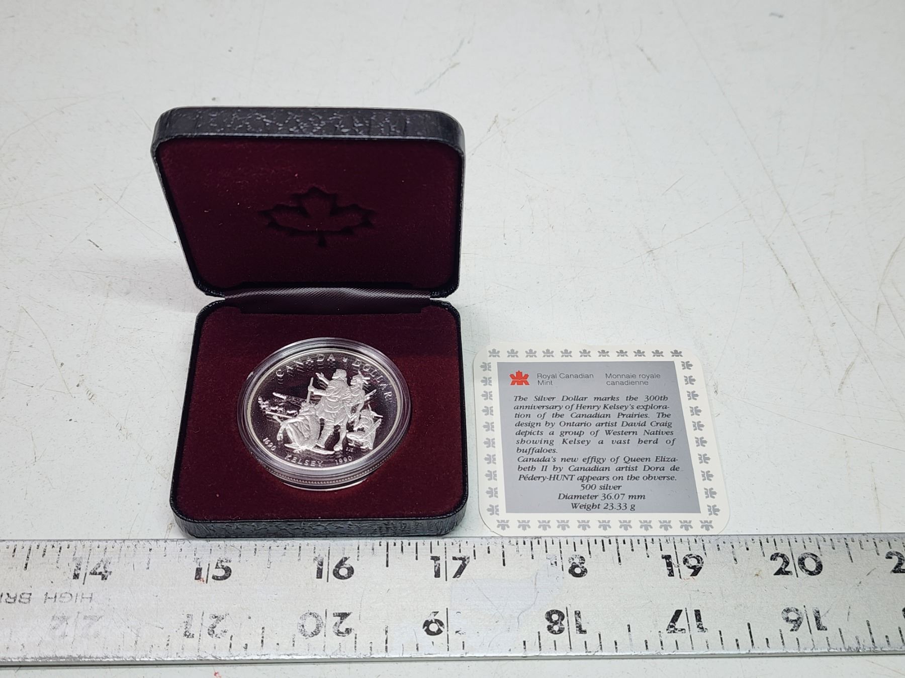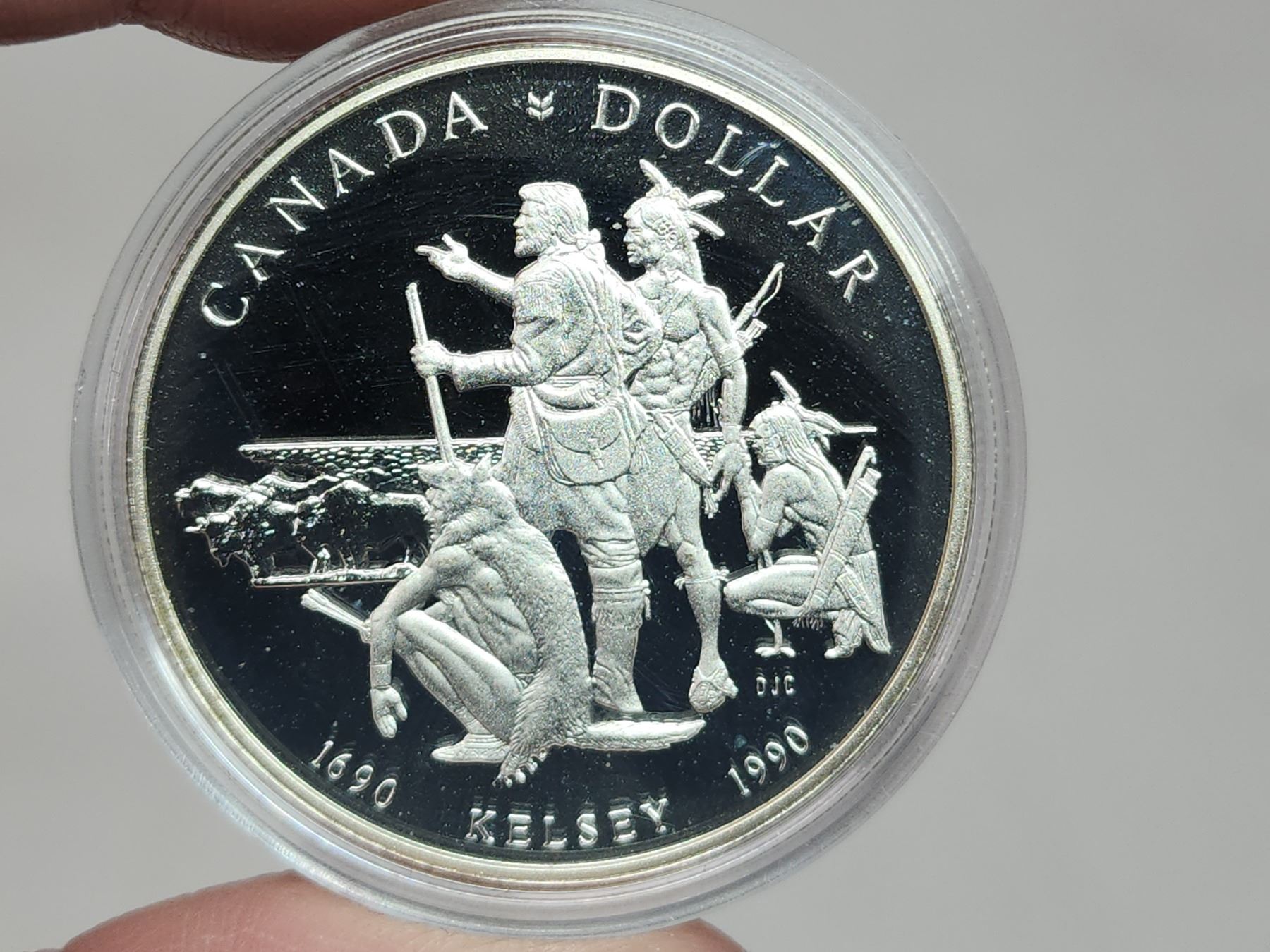 1990 Proof Silver Dollar. Commemorates the 325th Anniversary of Hudson’s Bay Company fur trader Henry Kelsey’s exploration of the Canadian West. Proof with Ultra Heavy Cameo. Bright White. Housed in its original Royal Canadian Mint case of issue. Includes Certificate of Authenticity.