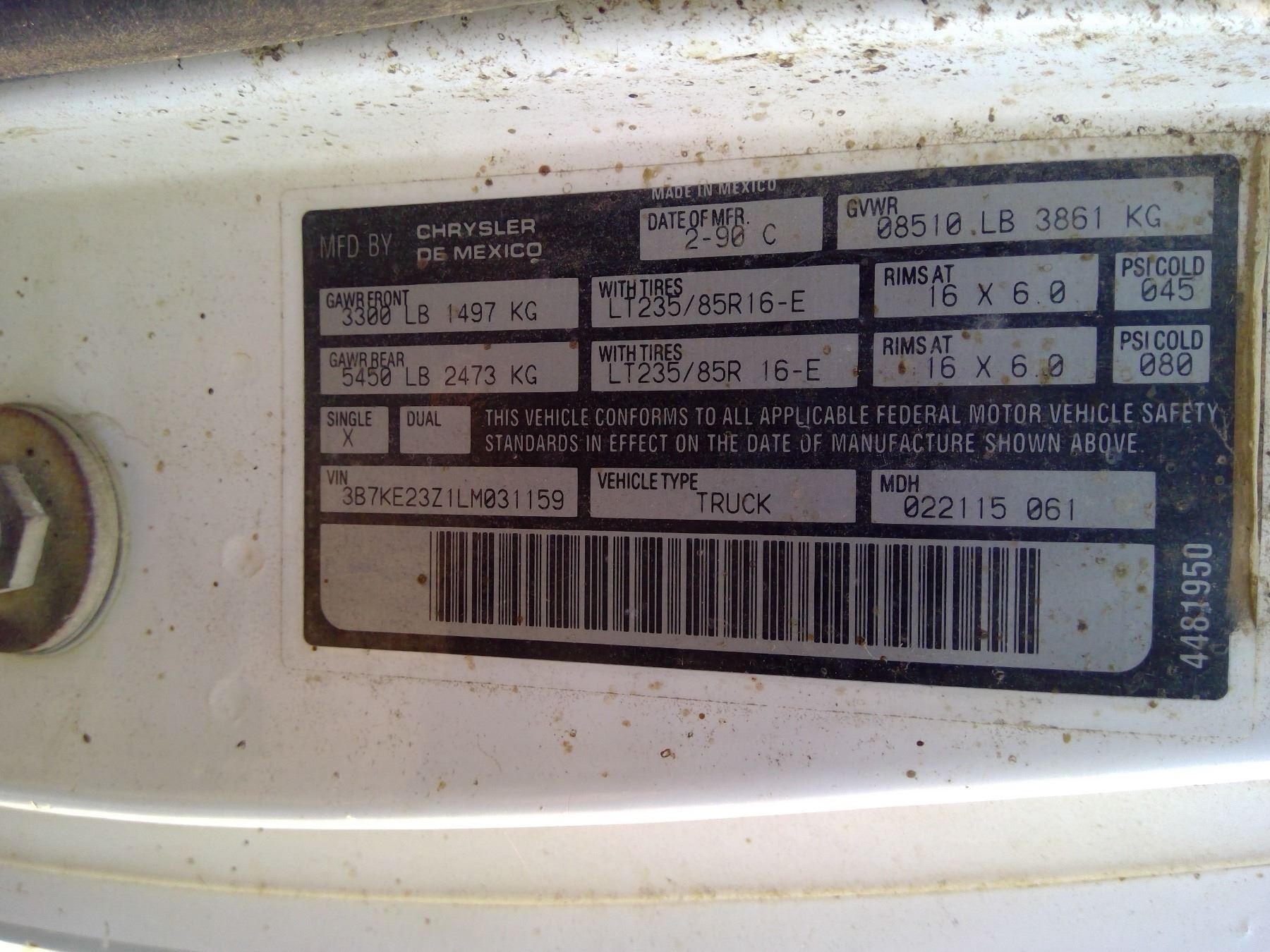 1990 RAM ext cab has keys VIN 3B7KE2321LM031159