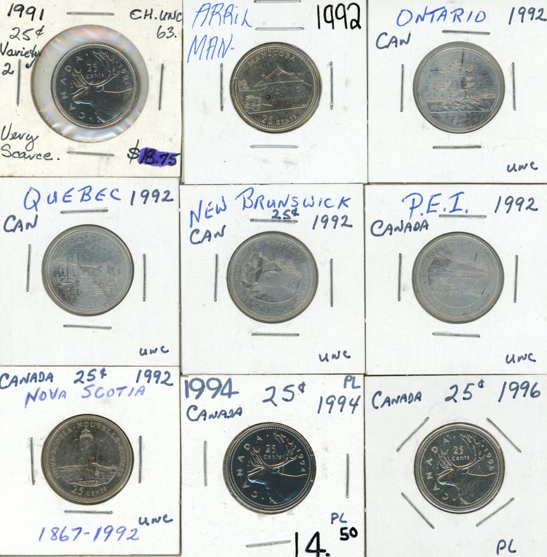 1991, 1992(April Man), 1992(Ontario), 1992(Quebec), 1992(New Brunswick), 1992(P.E.I.), 1992(Nova Scotia), 1996(Pride, Jan. Millenium), 2000, 2006(Breast Cancer, Color) Canadian Twenty Five Cents.