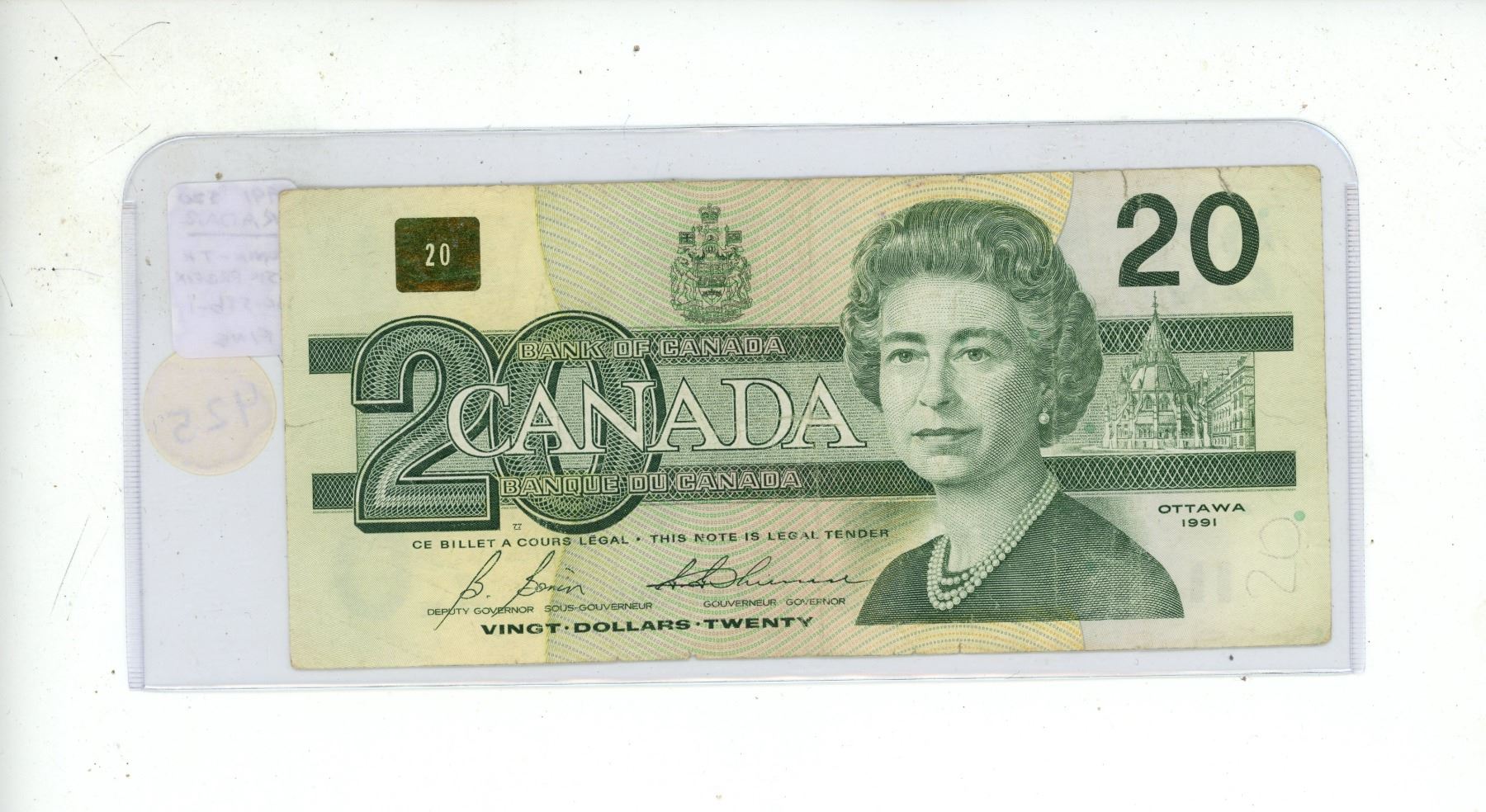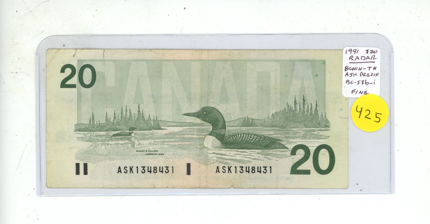 1991 $20 RADAR. Bonin-Thiessen signatures. ASK Prefix. RADAR Serial Number 1348431. BC58b-i. Fine12. Scarce.