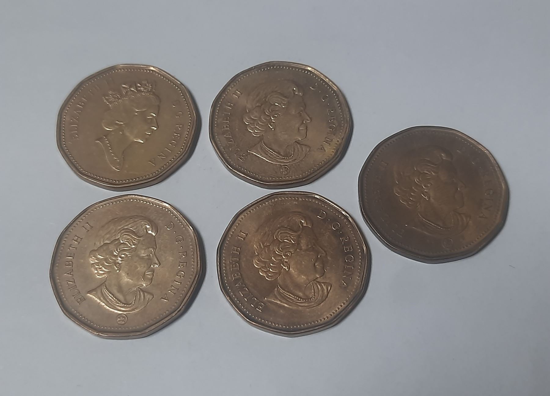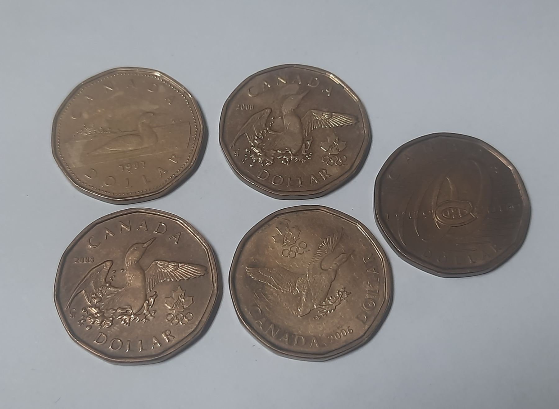 1991, 2006 Lucky Loonie, (2) 2008 Lucky Loonie, 2009 Canadian One Dollar.