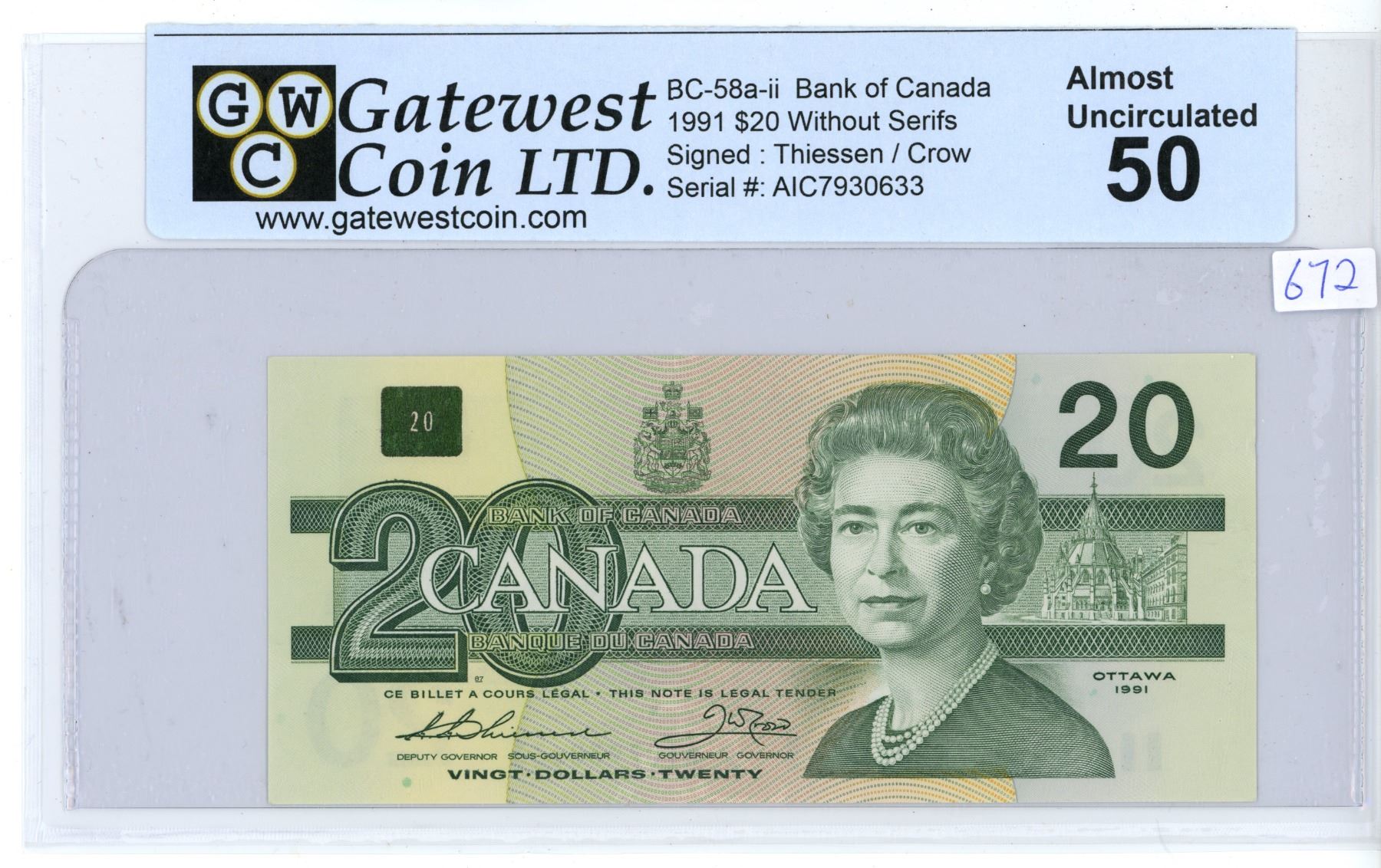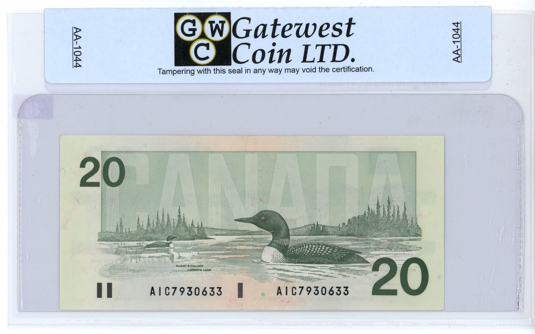 1991 Canadian 20 dollar bill - Thiessen/Crow - Prefix AIC 7930633 - GWC graded AU-50