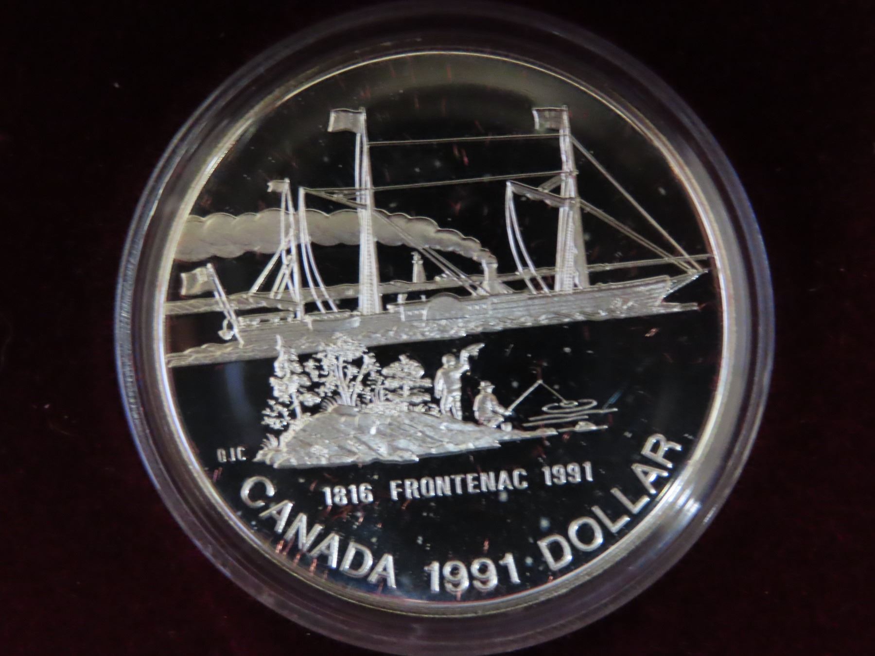 1991 Frontenac Proof Silver Dollar. 175th Anniversary of this famous steamship. Proof with Ultra Heavy Cameo. Bright White. Housed in its original black case of issue.