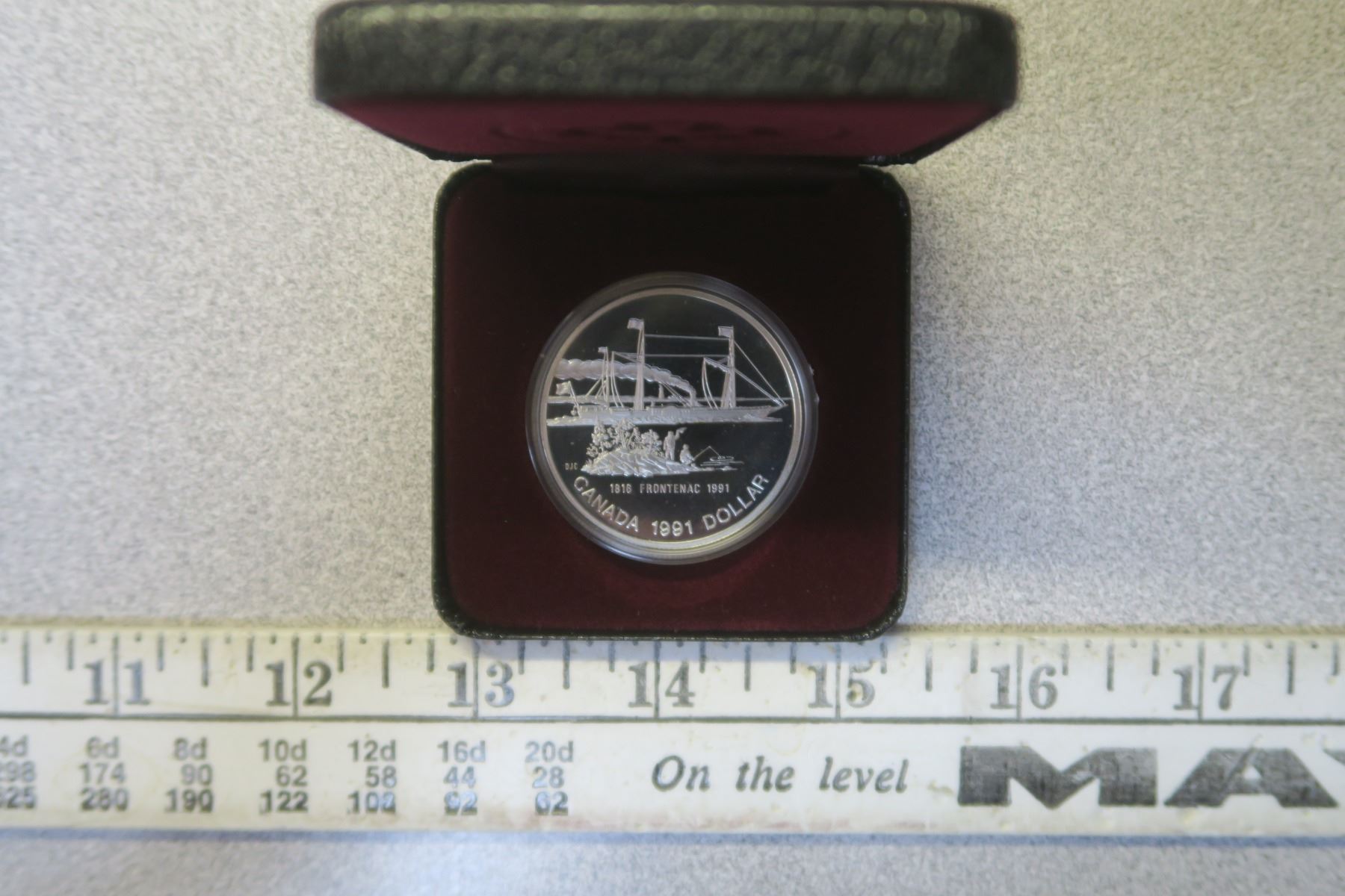 1991 Frontenac Silver Dollar. 175th Anniversary of the first commercial steamship on the Great Lakes. Housed in its original case of issue. Proof with Ultra Heavy Cameo. Bright White.