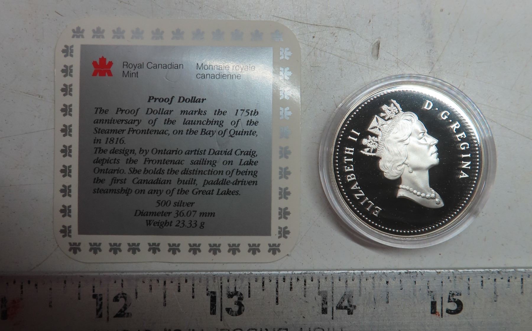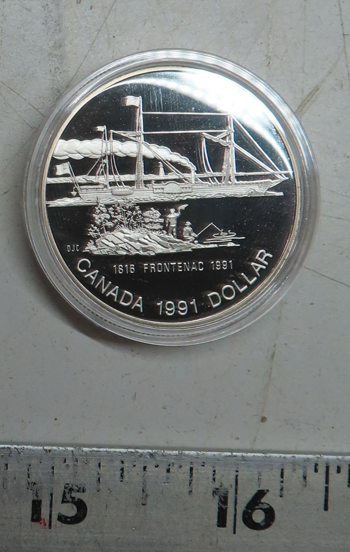 1991 Proof Silver Dollar. 175th Anniversary of the launching of the famous steamer, Frontenac. Proof with Ultra Heavy Cameo. Includes Certificate of Authenticity. Housed in its original Royal Canadian Mint case of issue.
