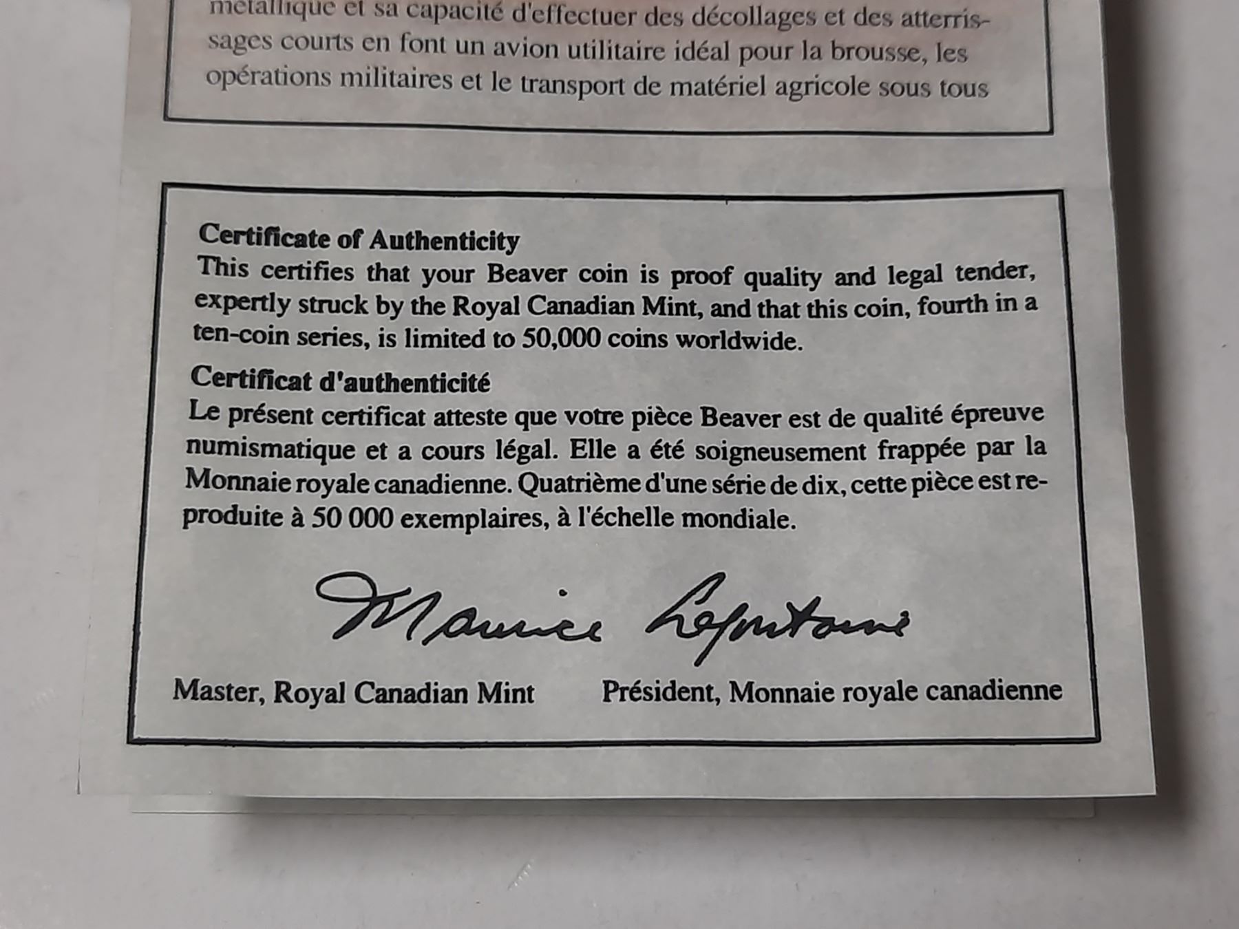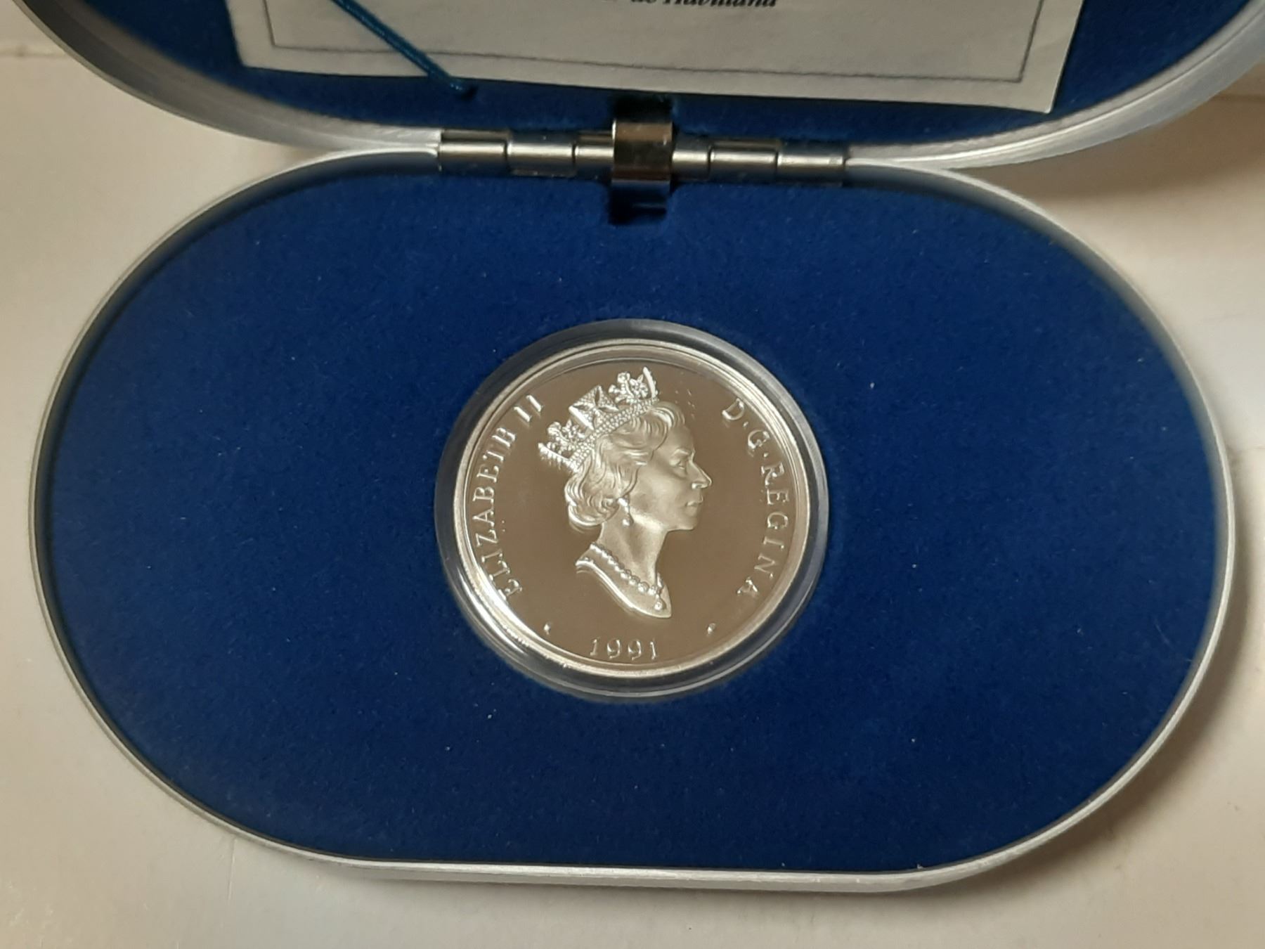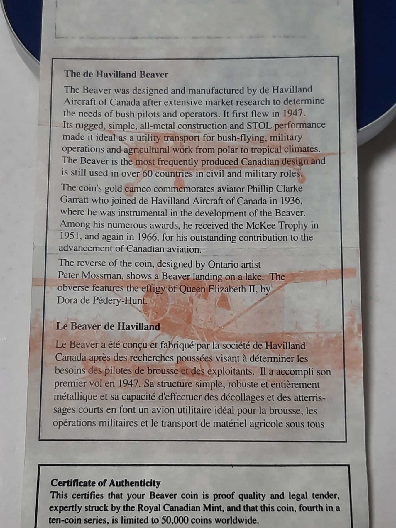 1991 Twenty dollar The de Havilland Beaver- One oz. 92.5 silver coin. 24KT gold covered cameo
