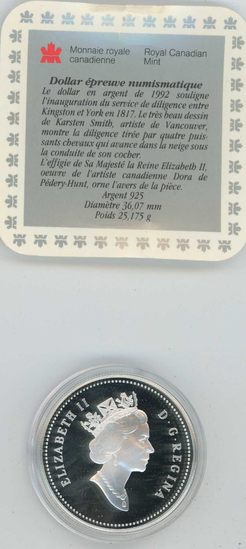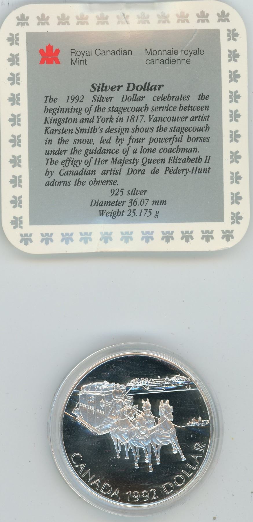 1992 CANADA PROOF $1.00 SILVER KINGSTON TO YORK STAGECOACH