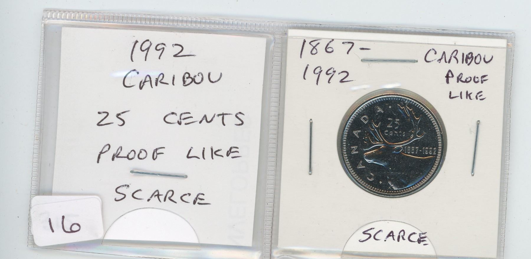 1992 CARIBOU 25 CENTS. PROOF LIKE-65. SCARCE.
