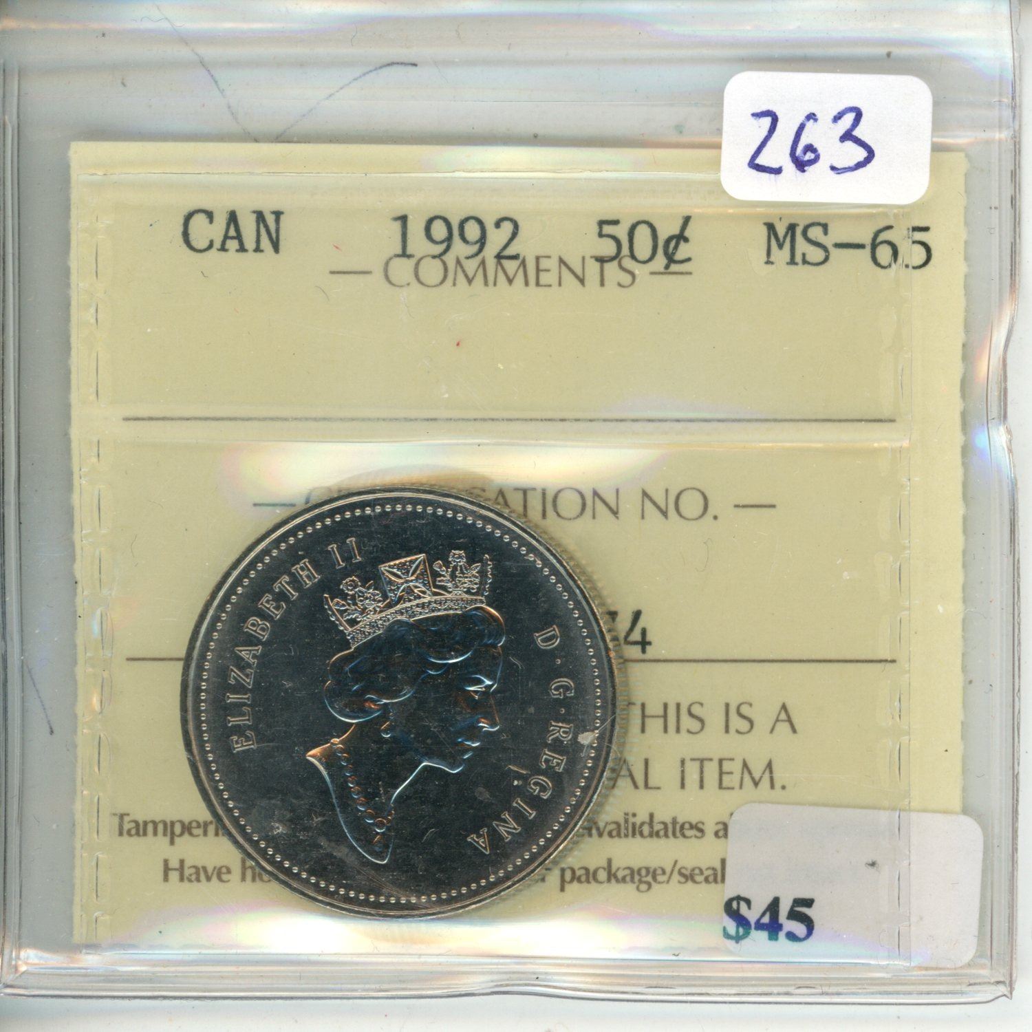1992 Canadian 50 Cents, ICCS certified & graded MS-65.