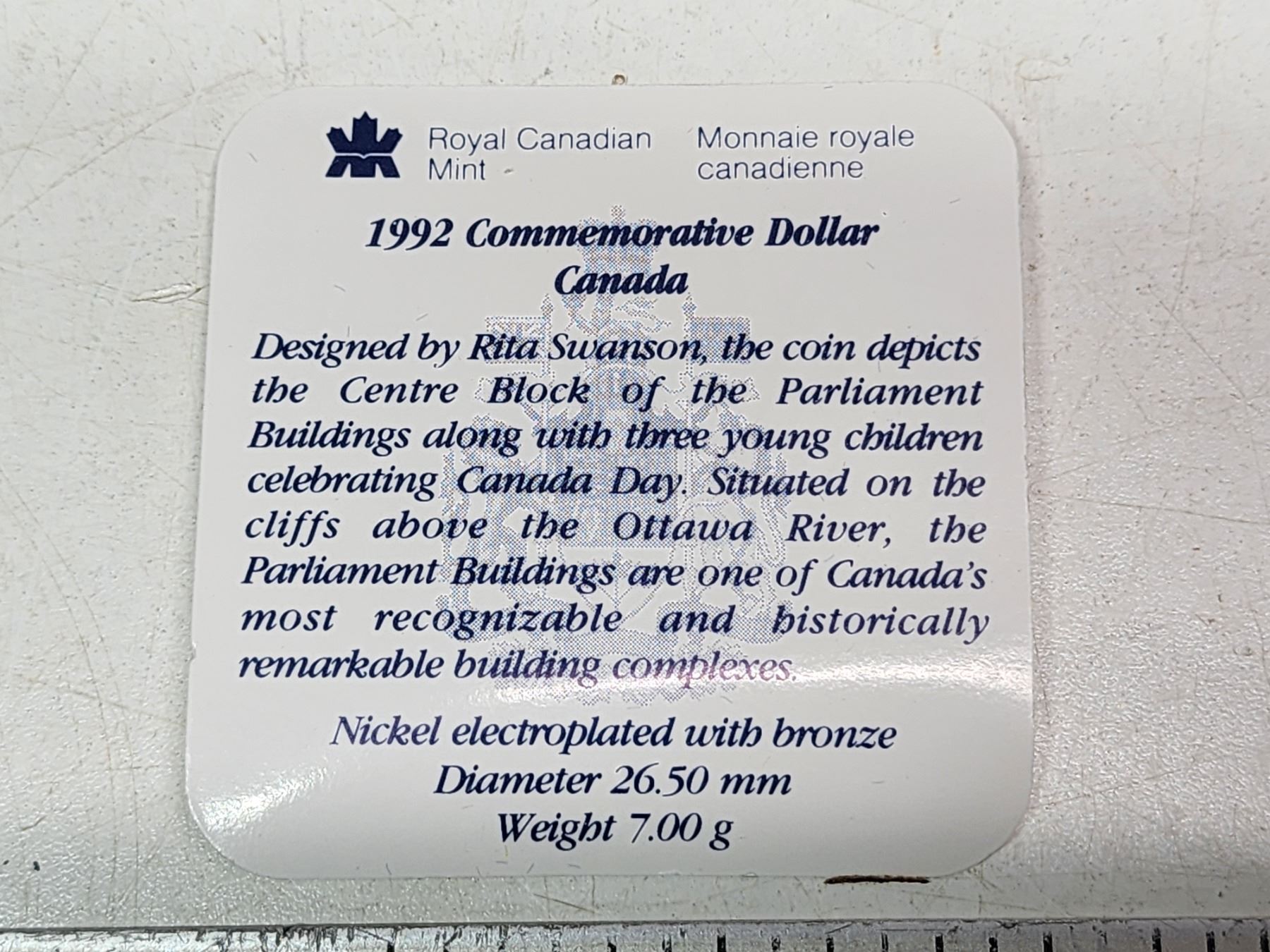 1992 Commemorative, Canadian 1 dollar "parliament" loonie coin