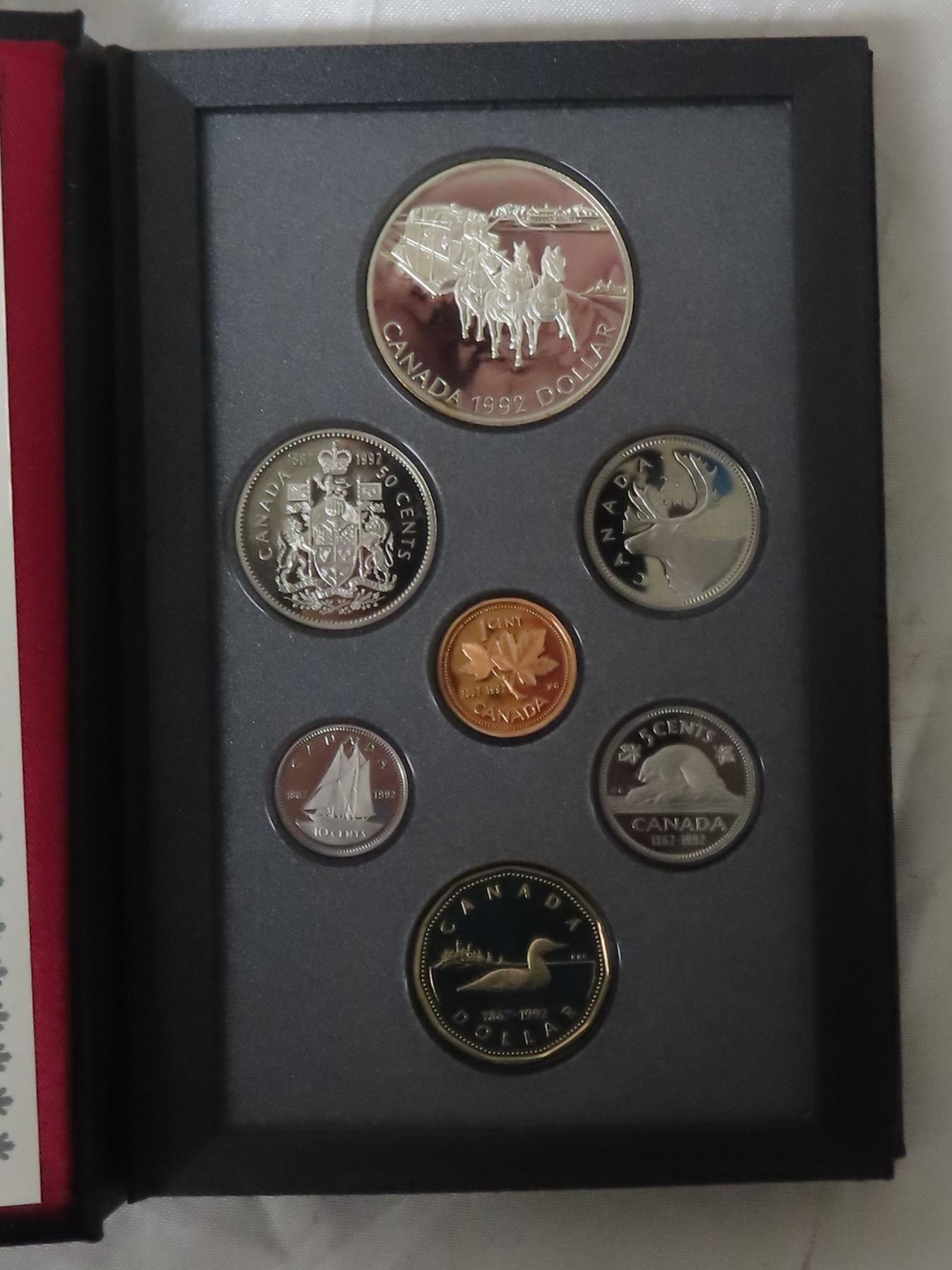 1992 Double Dollar Proof Set. The Silver Dollar commemorates the 175th Anniversary of the first stagecoach service between Kingston & York (now Toronto). Proof with Ultra Heavy Cameos. Housed in its original Royal Canadian Mint case of issue.