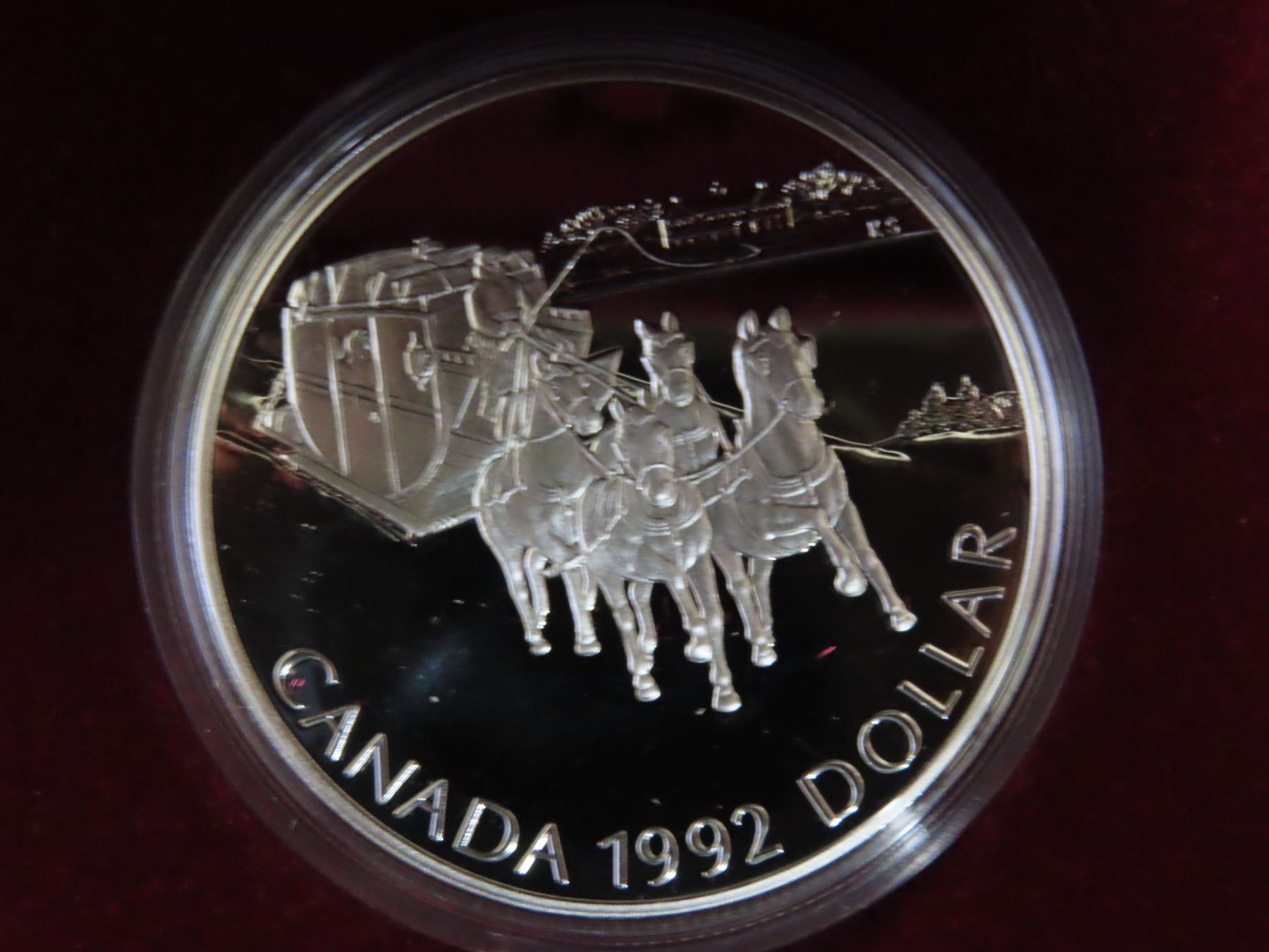 1992 Kingston Stagecoach Proof Silver Dollar. Celebrates the first stagecoach from Kingston to York (now Toronto). Proof with Ultra Heavy Cameo. Bright White. Housed in its original black case of issue.