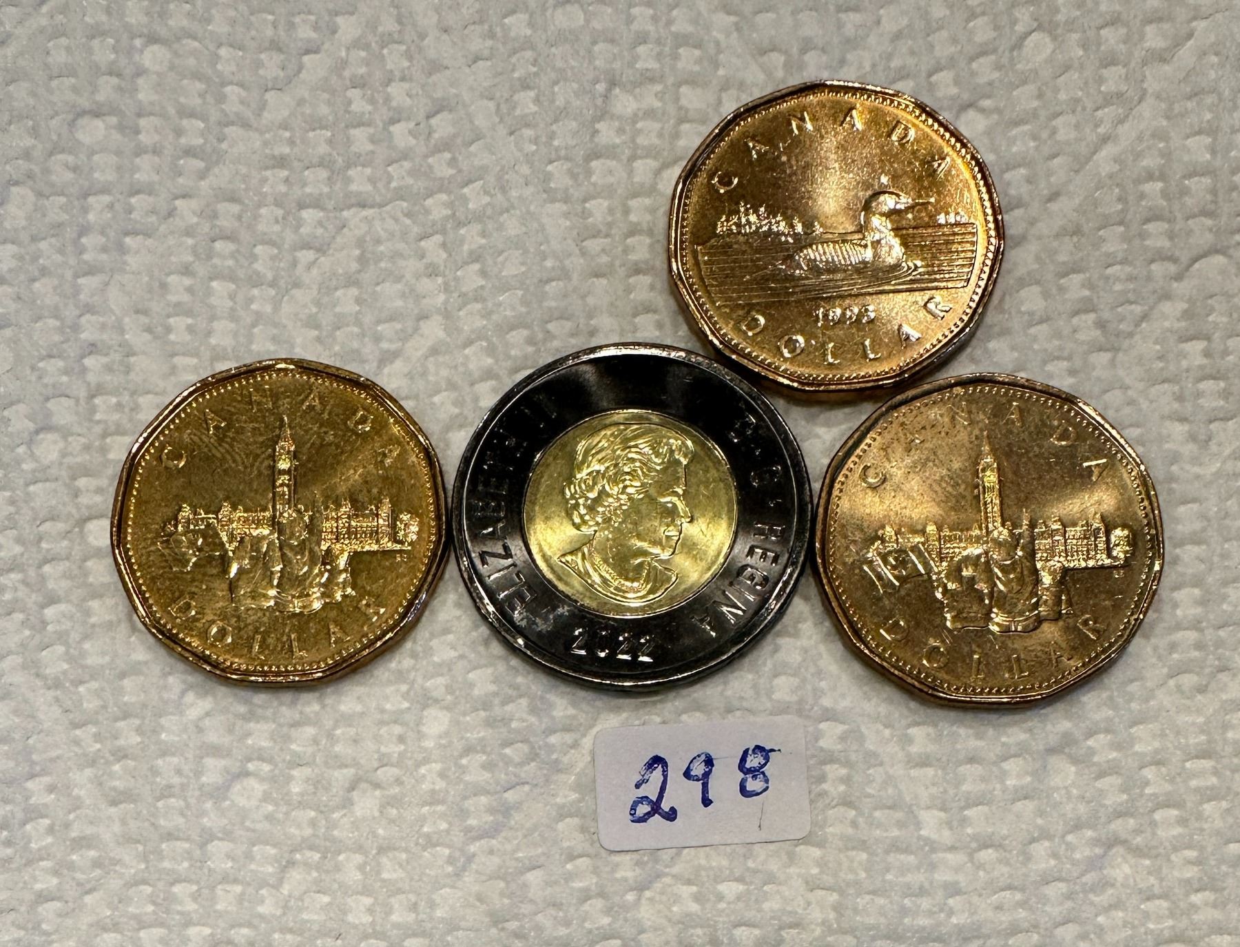 1992 Parliament Loonies, 1993 Loonie and 2022 black ringed Toonie