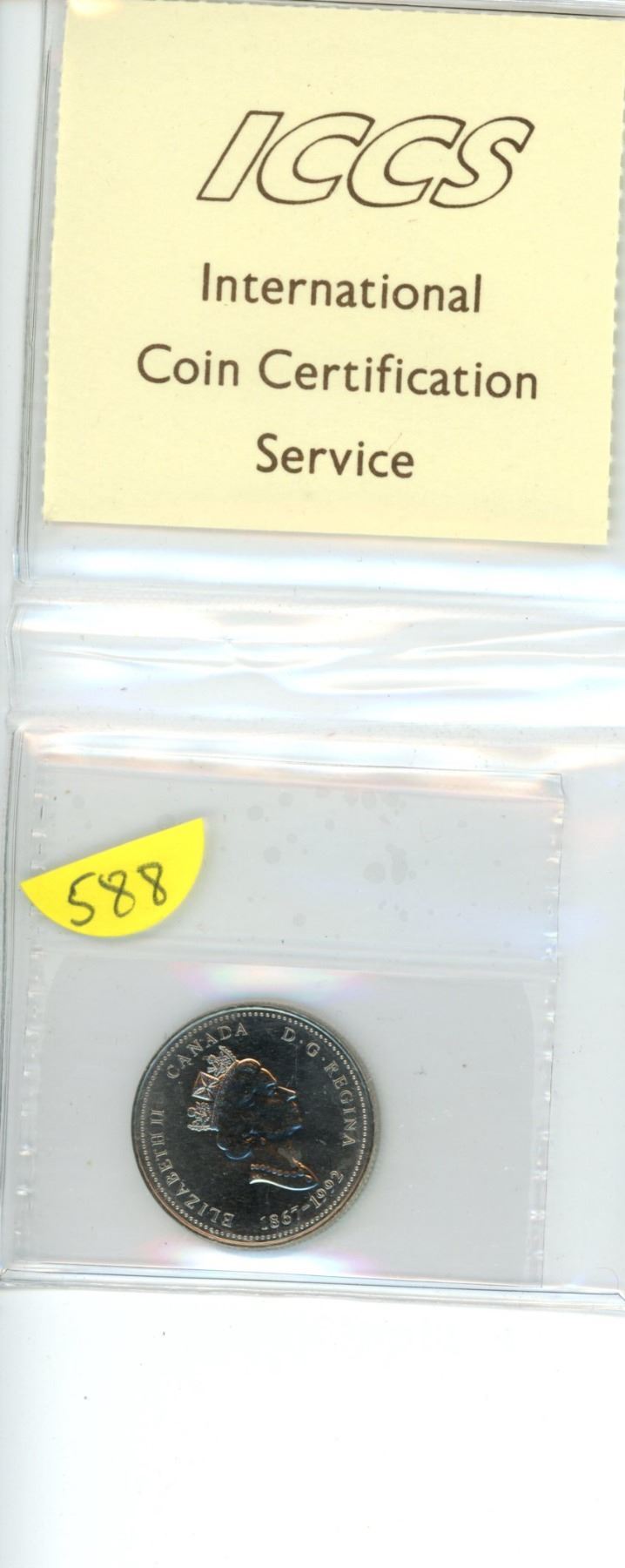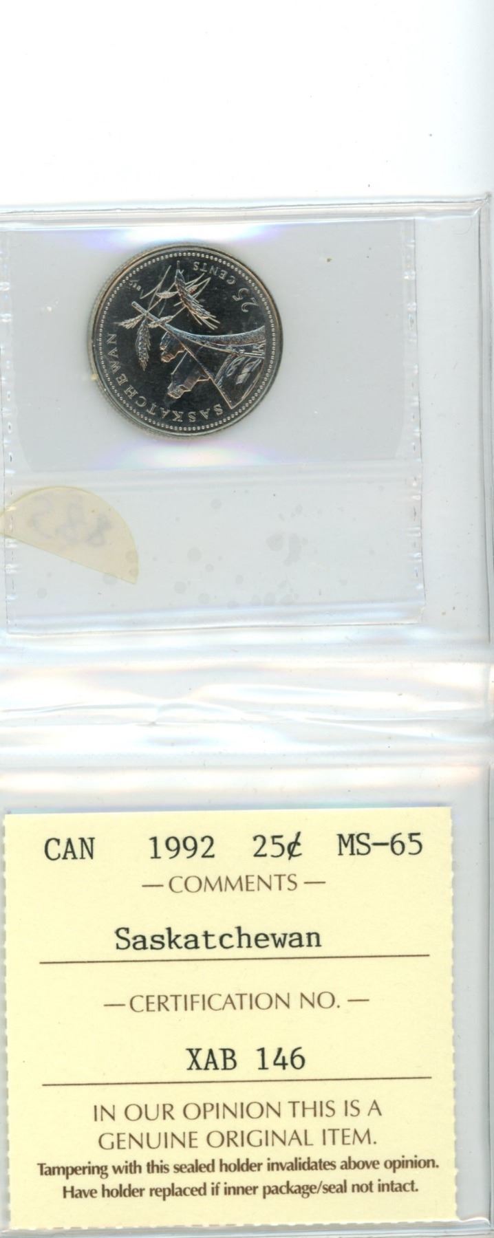 1992 Saskatchewan 25 cents. ICCS graded and certified MS-65 Saskatchewan.
