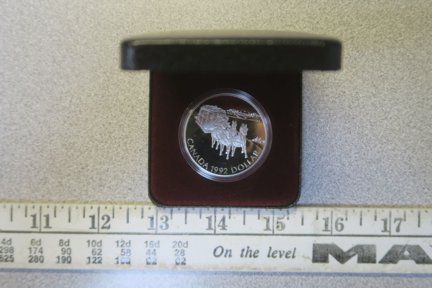 1992 Stagecoach Silver Dollar. 175th Anniversary of the first stagecoach service between Kingston & York (now Toronto). Housed in its original case of issue. Proof with Ultra Heavy Cameo. Bright White.