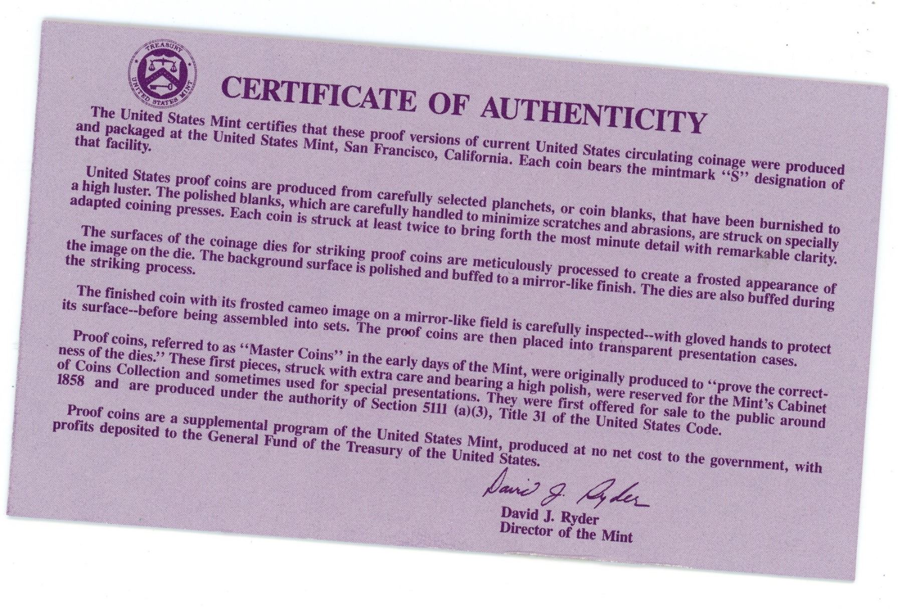 1993 united states mint proof set wit hcertificate of authenticity