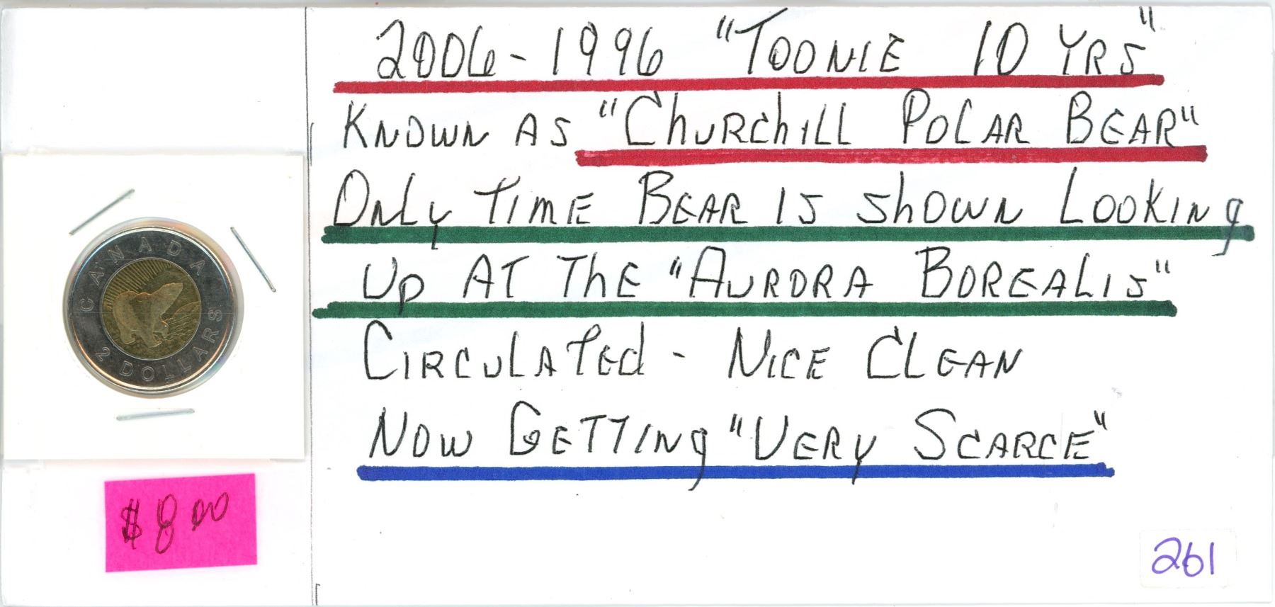1996-2006 "toonie ten years", Churchill polar bear looking up at the Aurora Borealis - Canadian $2.00 two dollar coin