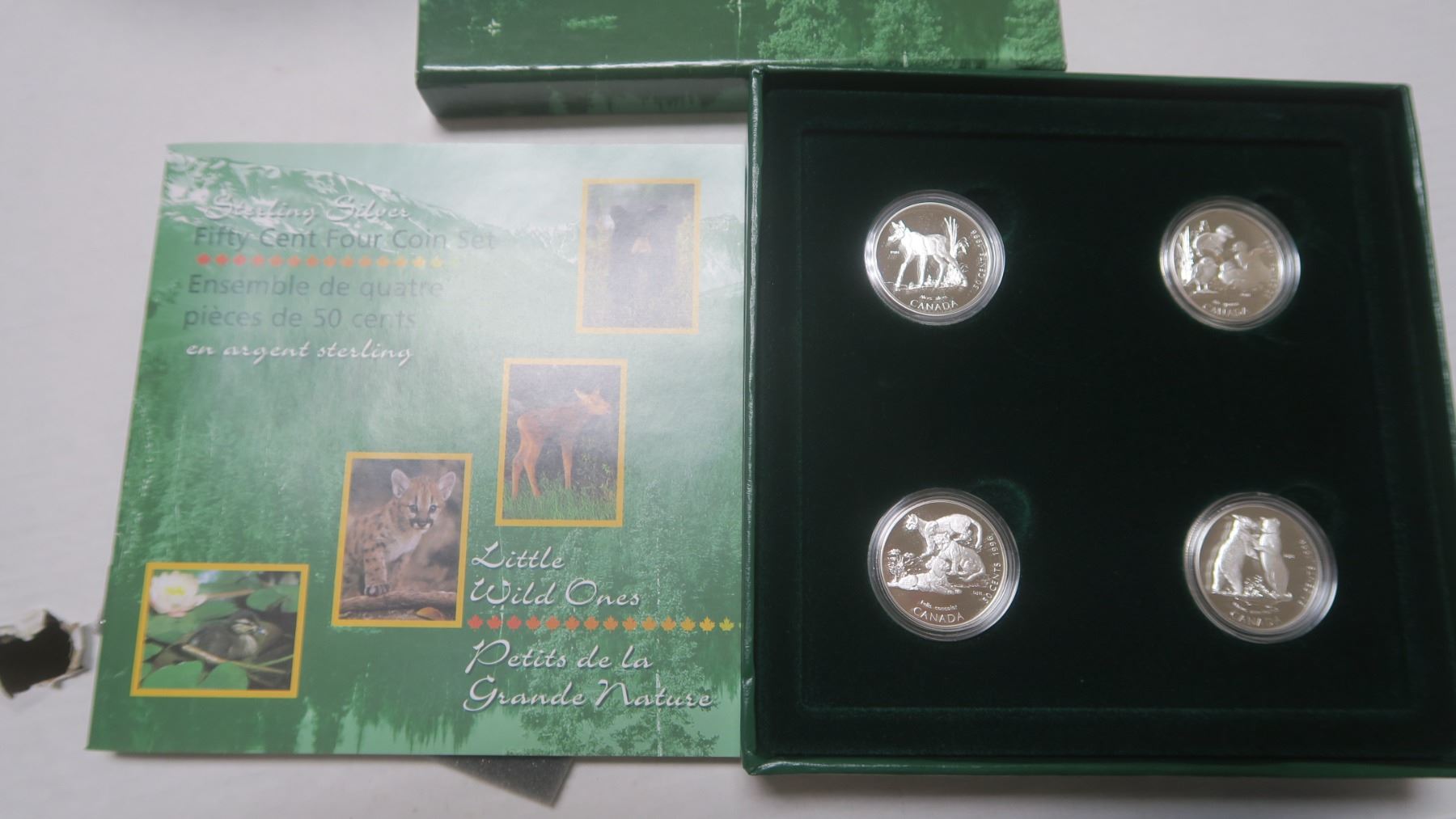 1996 Discovering Nature Little Wild Ones 4-coin 50 Cents. Includes moose calf, wood ducklings, cougar kittens & black bear cubs. Sterling Silver. Proof with Ultra Heavy Cameos. Housed in its original case & box of issue.