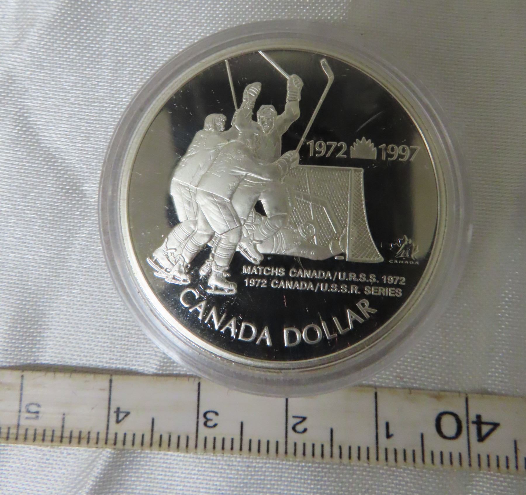 1997 Canada-Russian Hockey Series Silver Dollar. Sterling Silver. Proof with Ultra Heavy Cameo. Housed in its original Royal Canadian Mint case of issue.