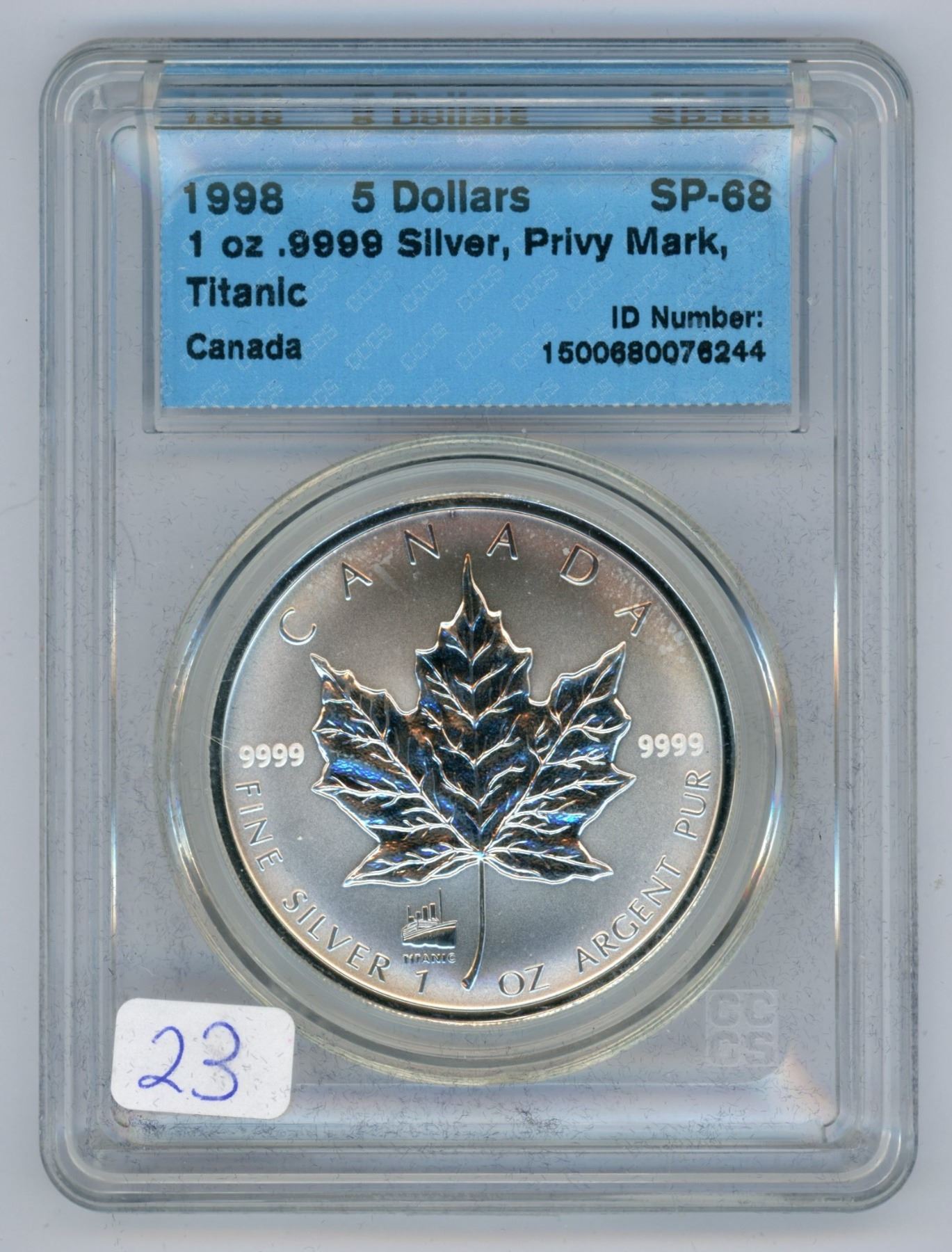 1998 CCCS graded. Titanic, Canadian 1oz fine silver 5 dollar coin - SP 68