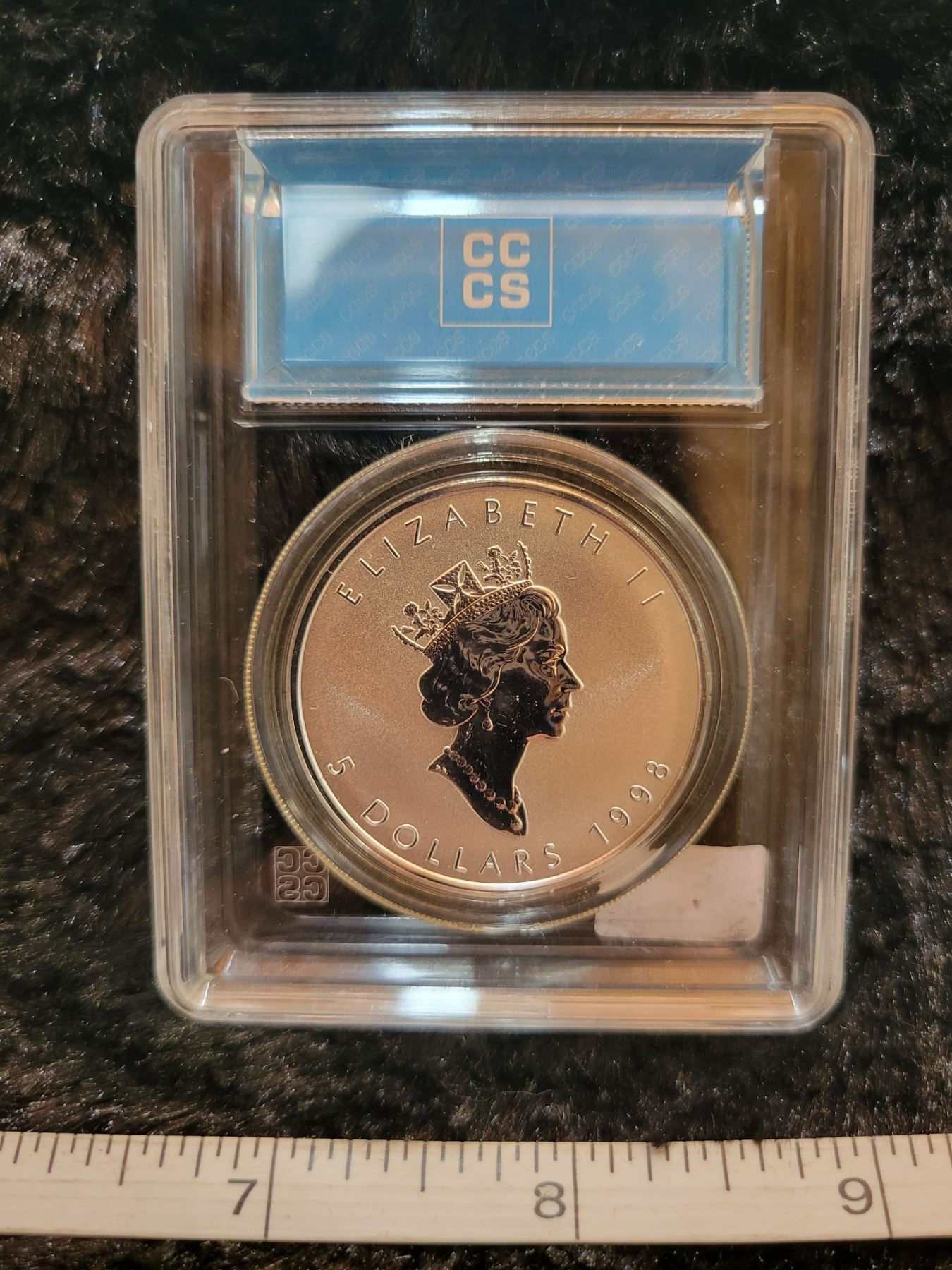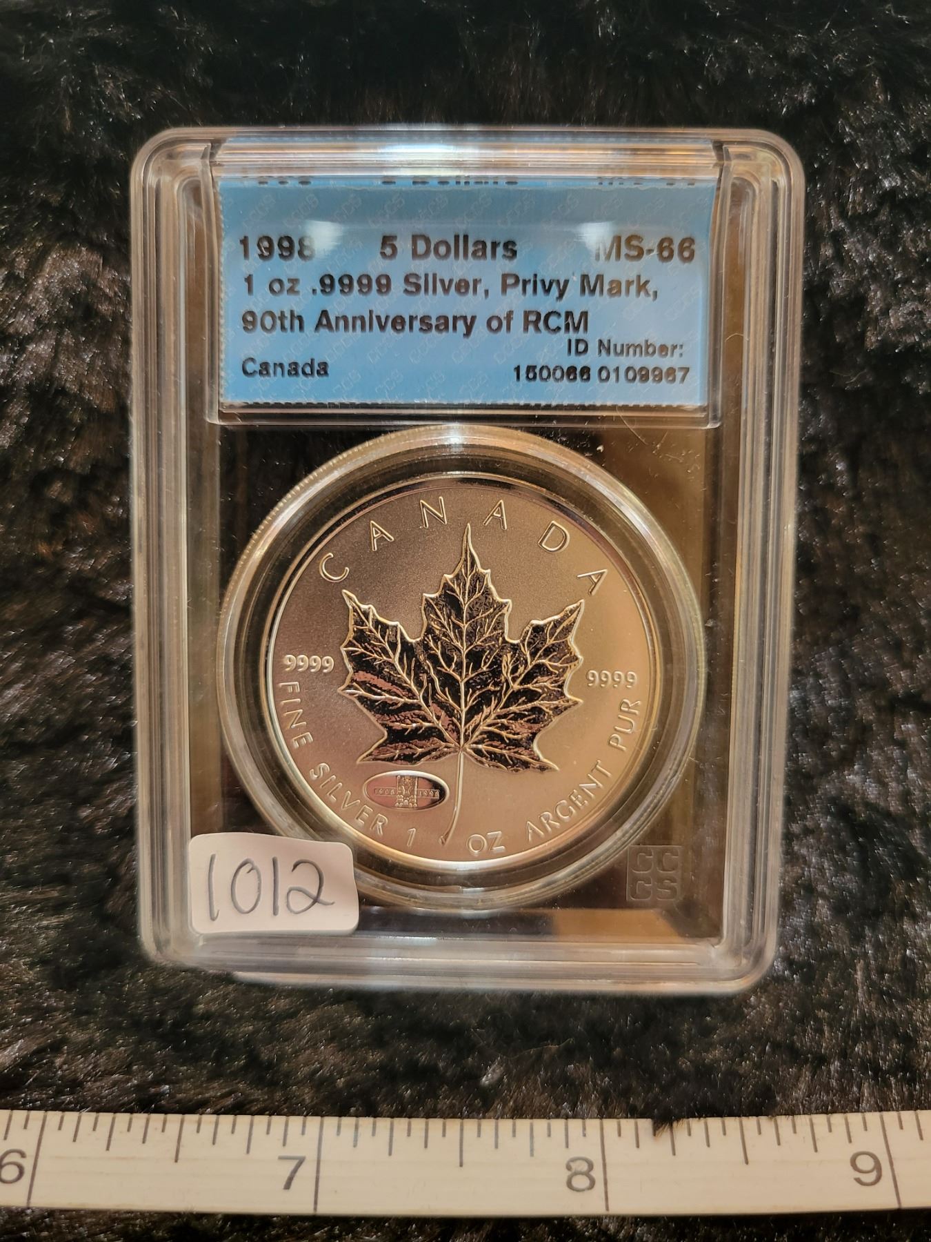 1998 Canada $5.00 five dollars 1 oz .9999 Silver, Privy Mark, 90th anniversary of RCM CCCS MS-66