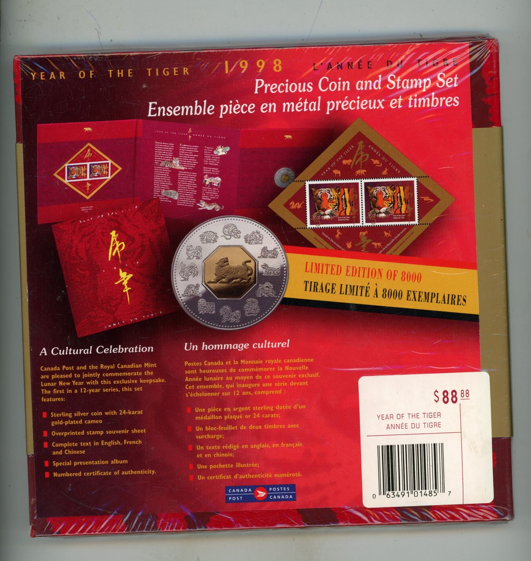 1998 Canadian Year Of The Tiger Stamp And Coin Set - Sterling Silver Coin With Gold Plated Cameo. (Sealed Pack Never Open)