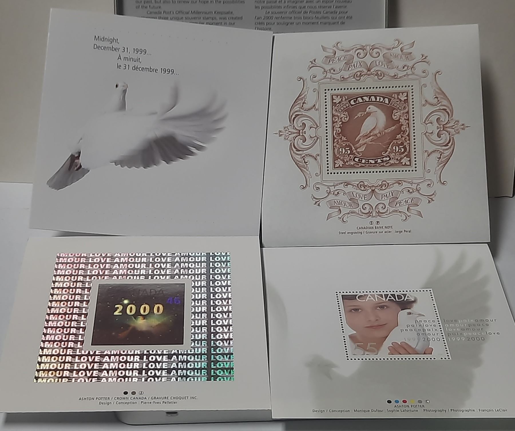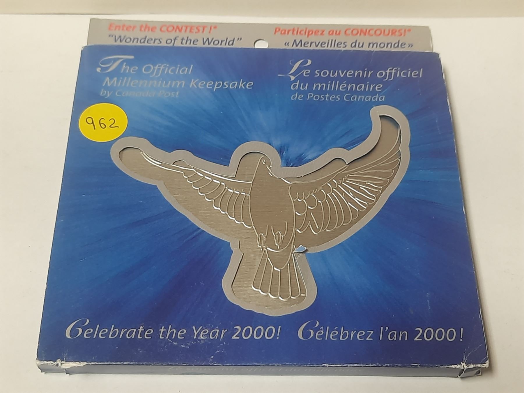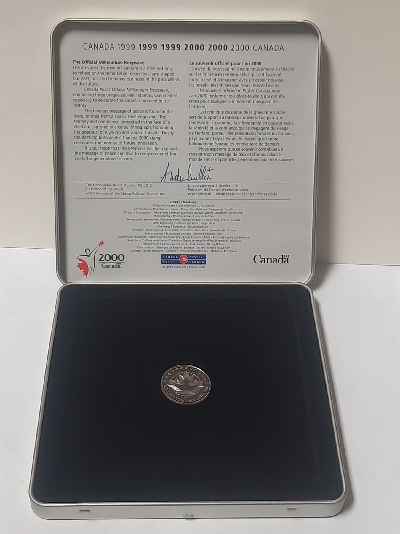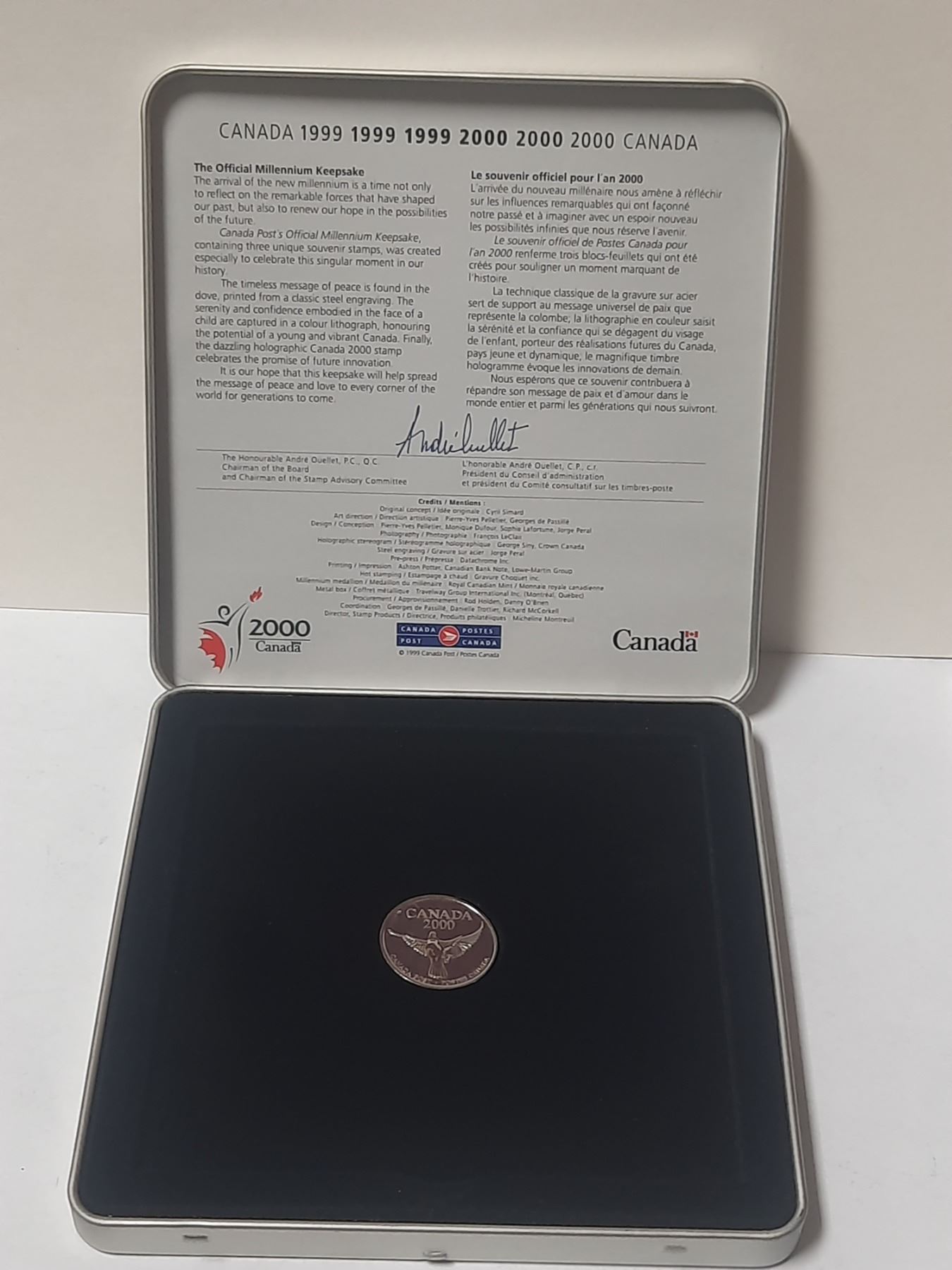 1999 – 2000 Official Millennium Keepsake. Contains 3 Stamps and a Canada Post dove medal. Housed in its original packaging.